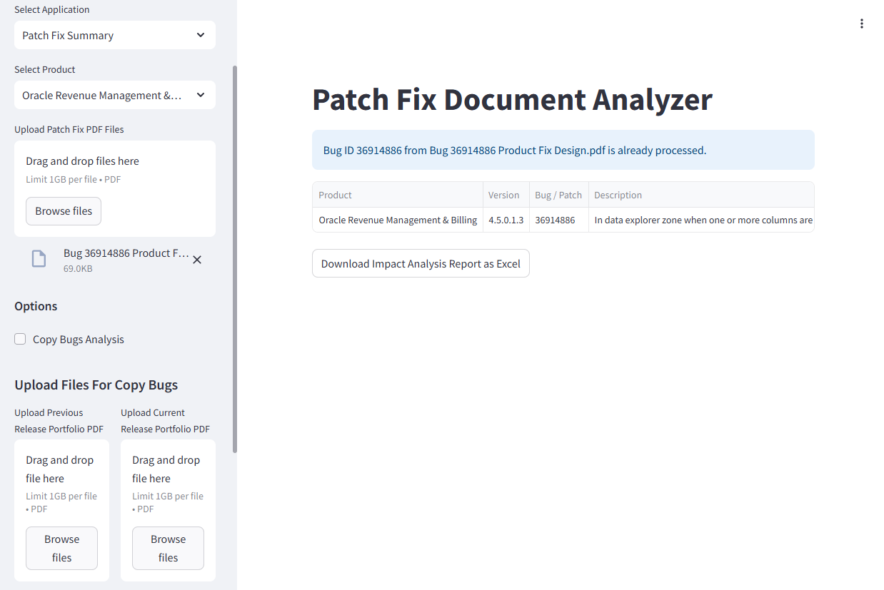 Patch Fix Summaryin the Select Application dropdown list. - Select the product for analysis in the Select Product dropdown list.