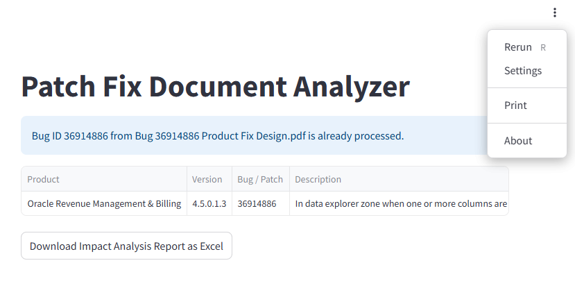 The generated report can be exported as an Excel file by clicking the Download Impact Analysis Report as Excel button. You can also regenerate the report by navigating to the upper-right menu and clicking Rerun.