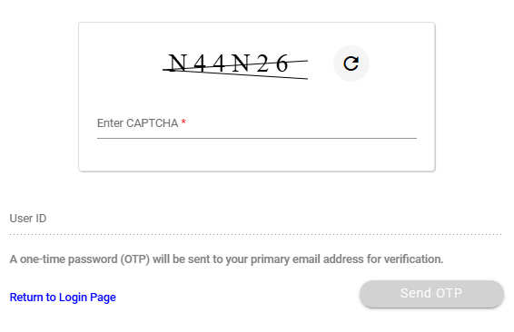 Enter your email address in the User ID textbox. The Send OTP button is enabled once an email address is entered.