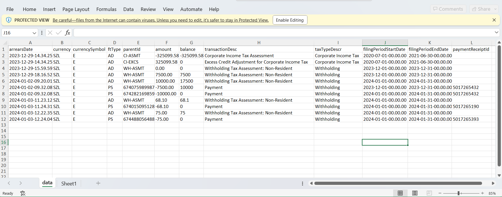 Open the file. The file displays additional columns providing more information for the financial transaction.