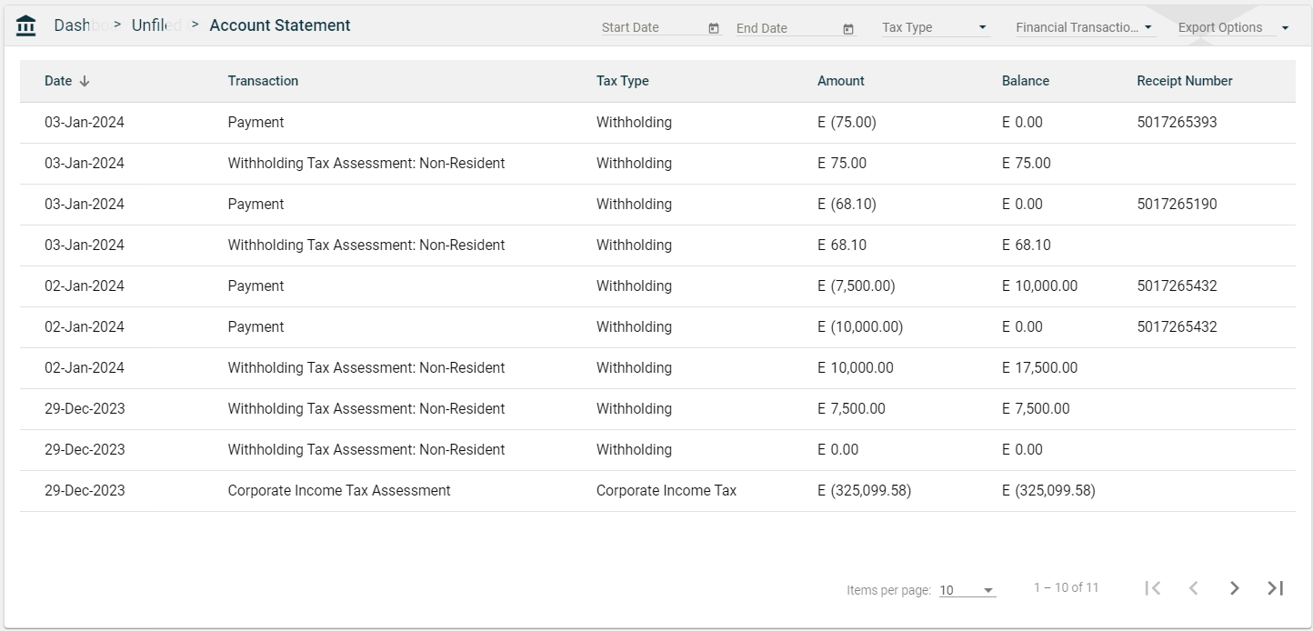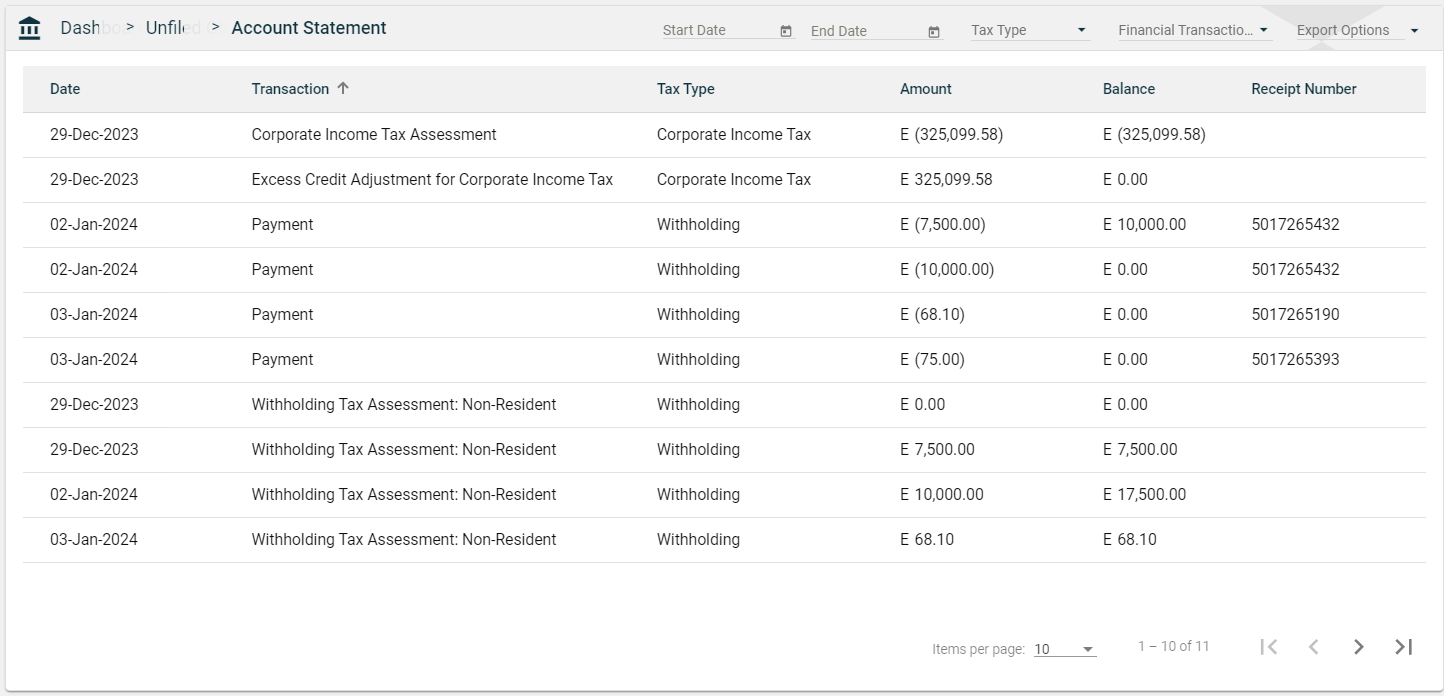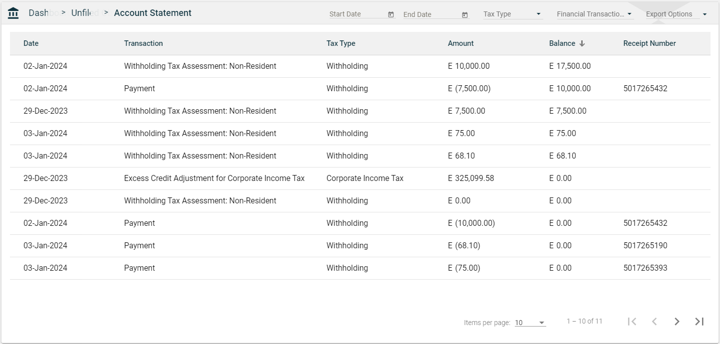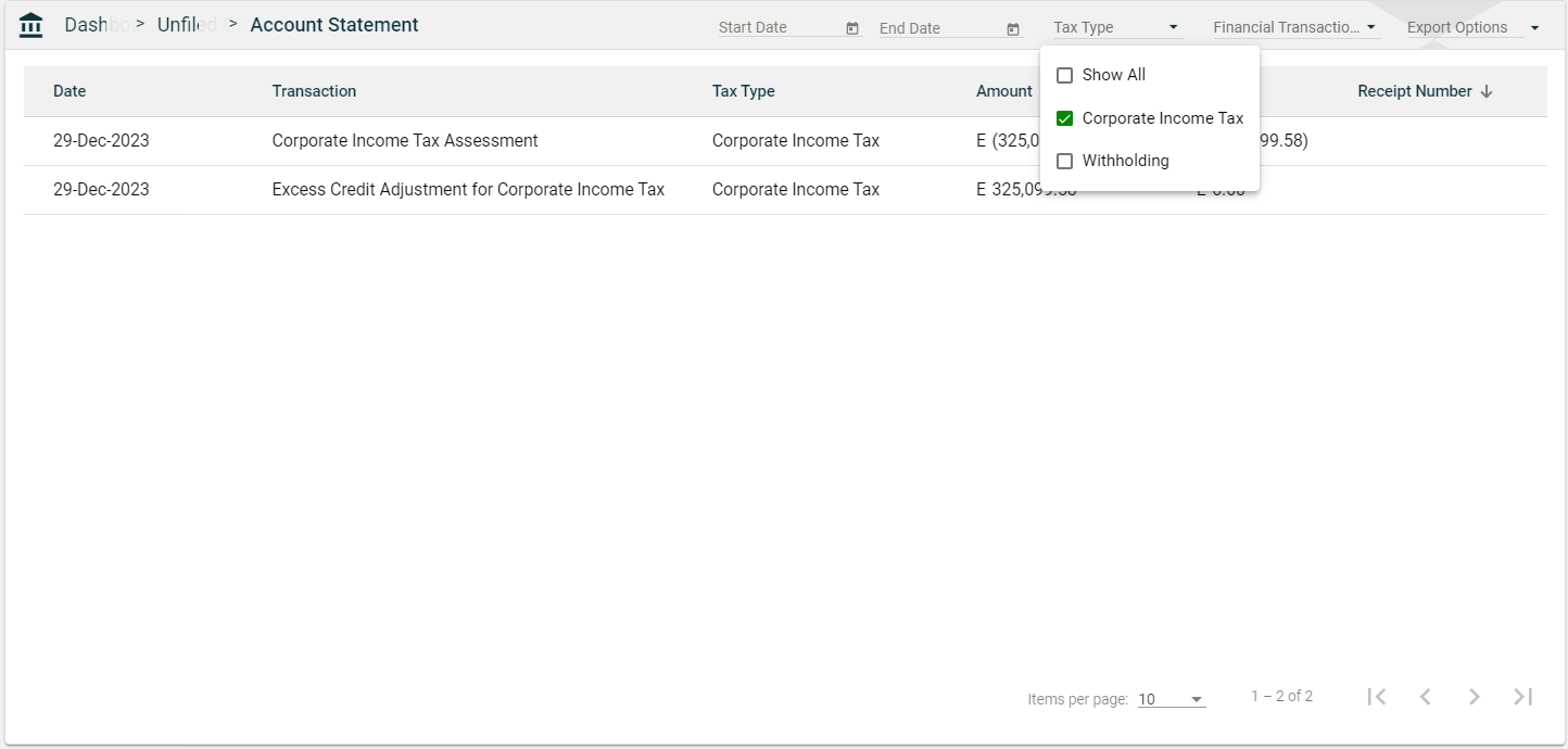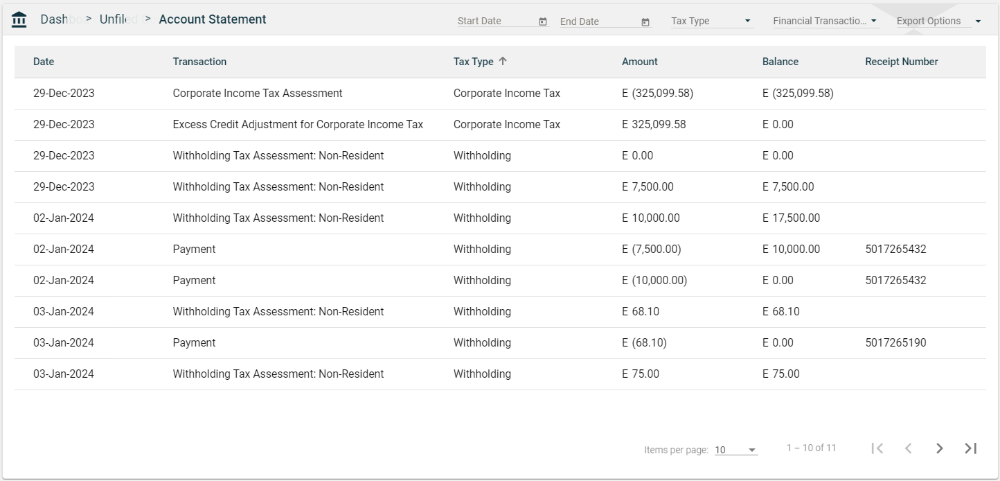 The Account Statement page allows you to filter transactions by dates, tax type, or financial transaction type.