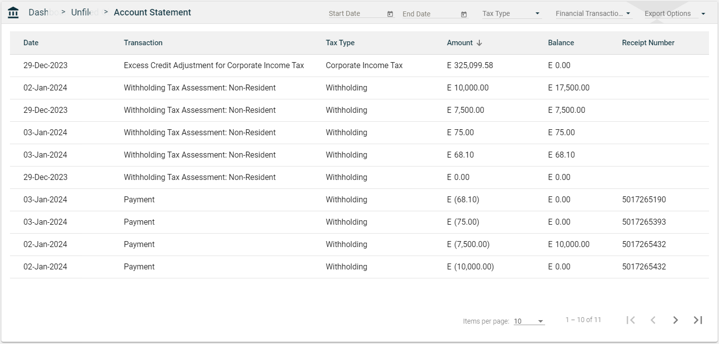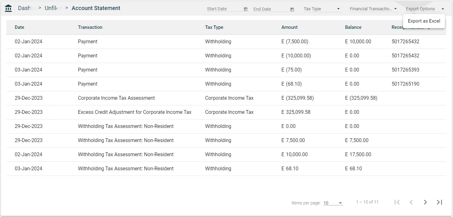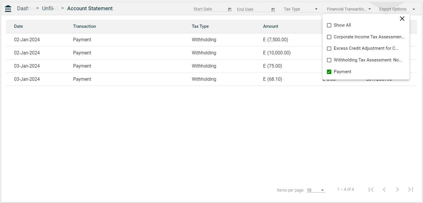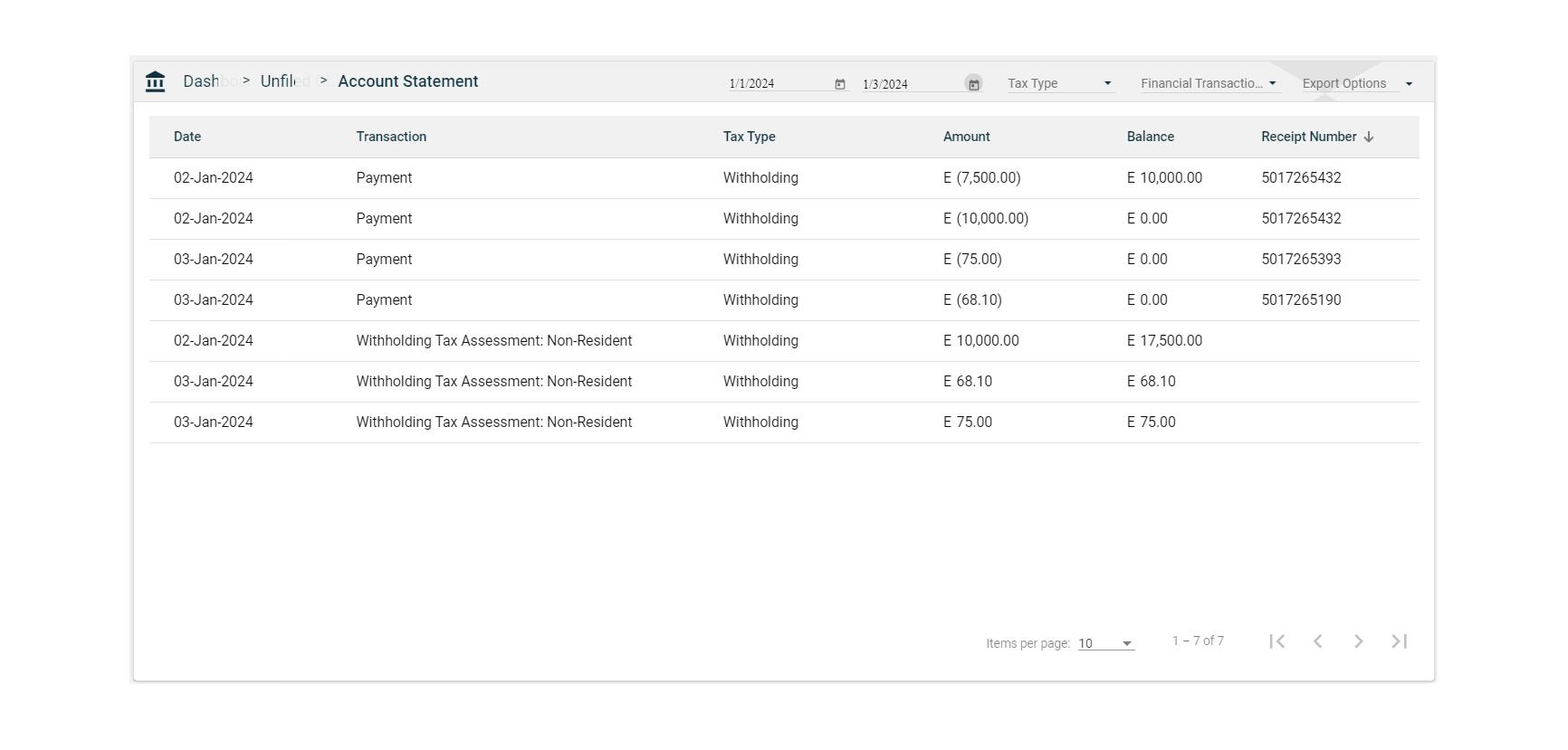 The Account Statement page allows you to filter transactions by dates, tax type, or financial transaction type.