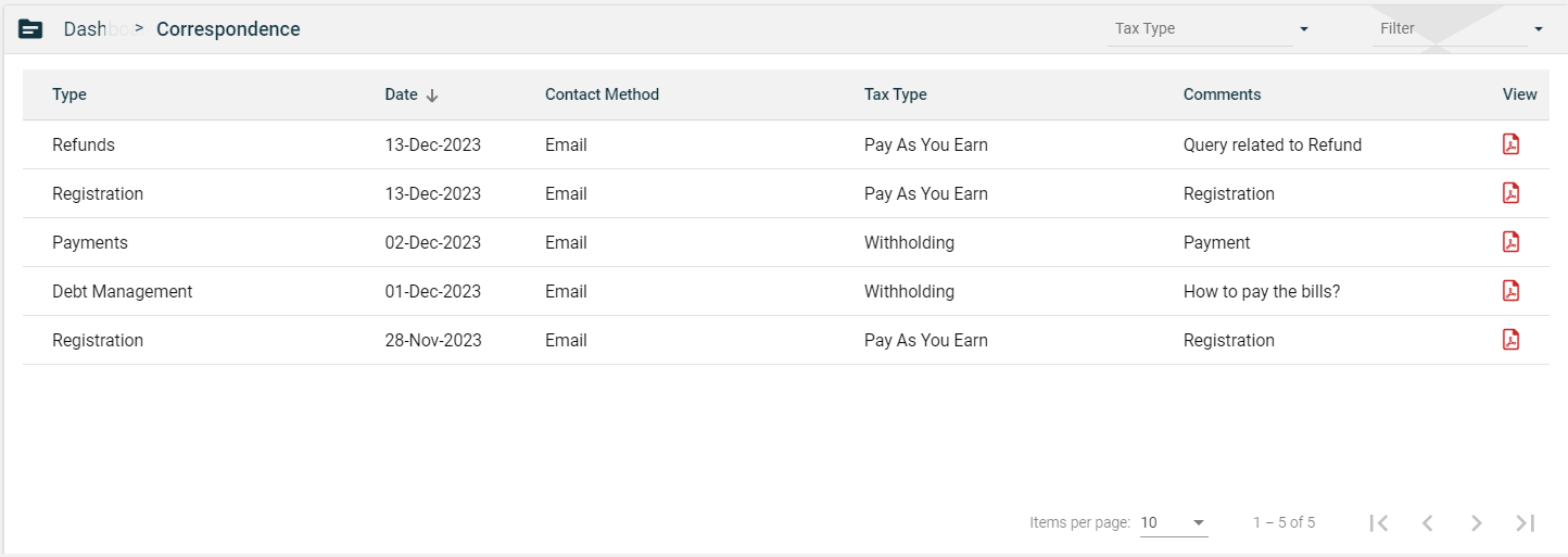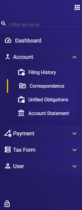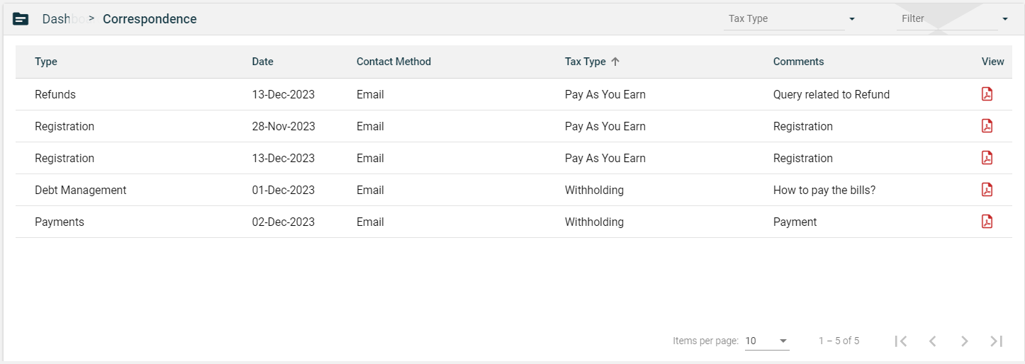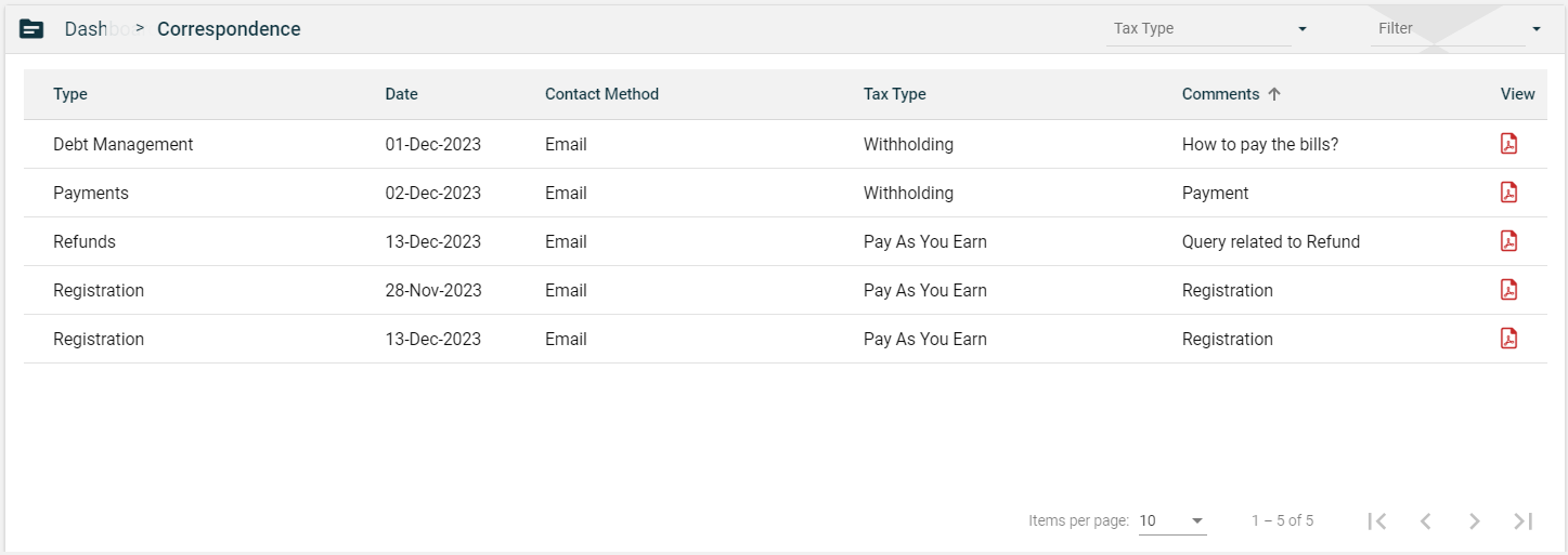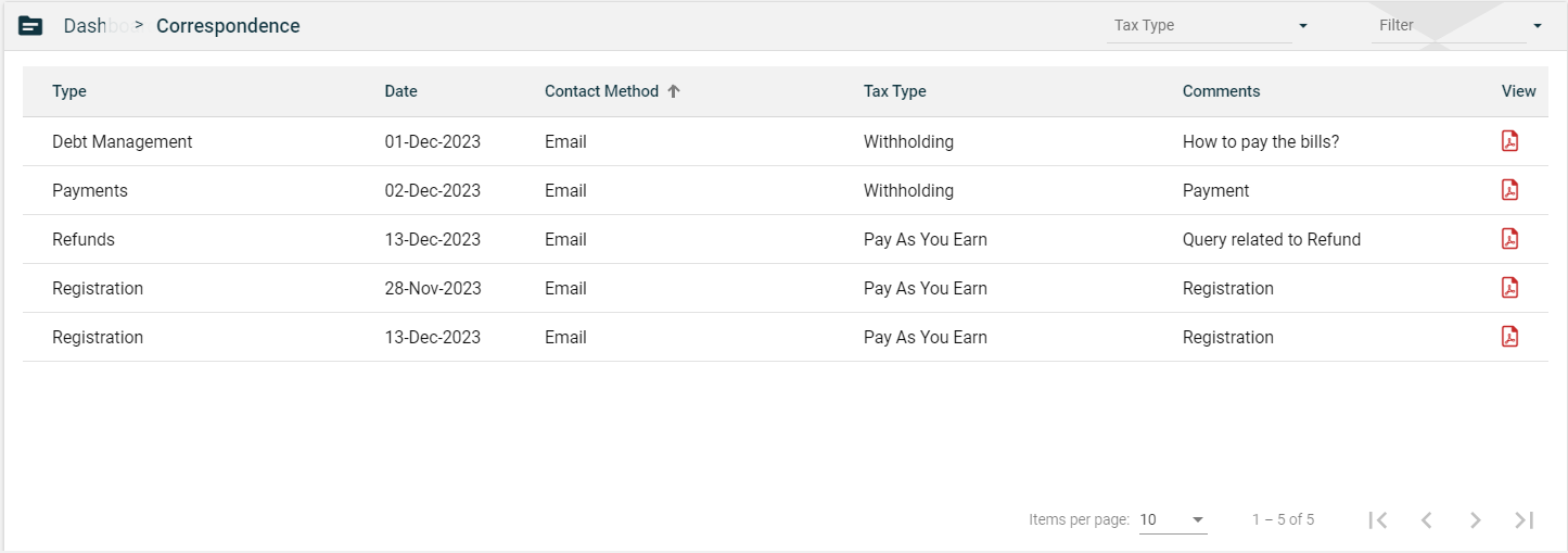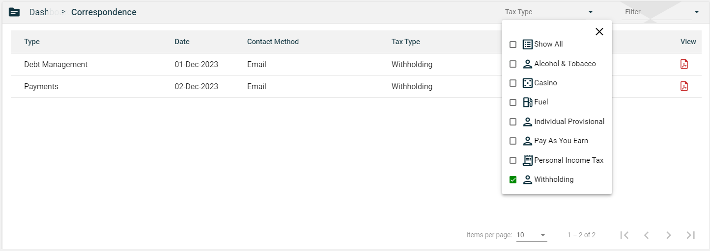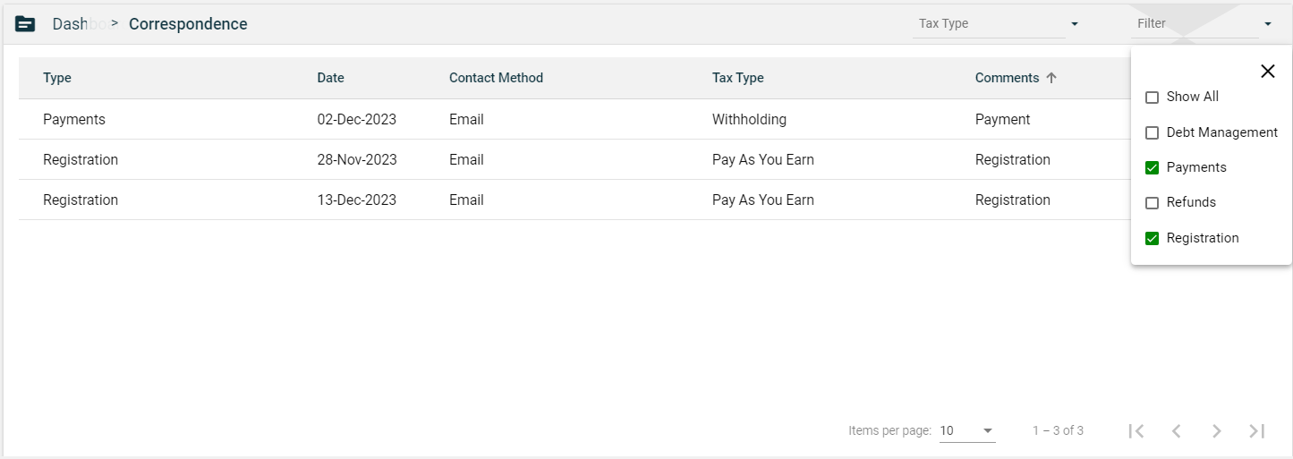 The Correspondence page allows you to filter transactions by correspondence or tax type.
