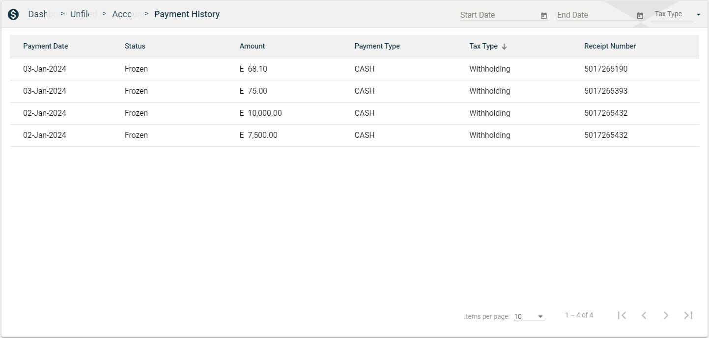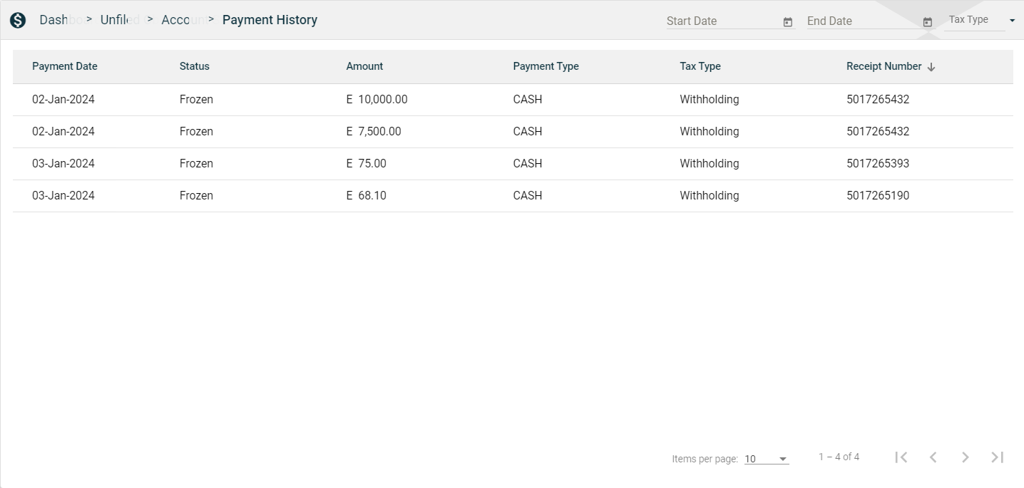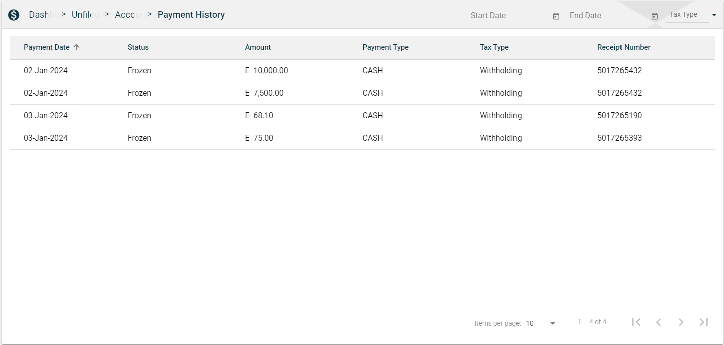 The Payment History page provides a comprehensive record of all transactions, including payment amounts, types, and dates. This page enables you to monitor and stay updated on your payments.