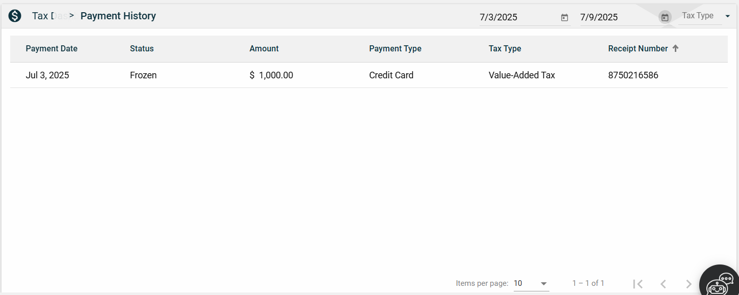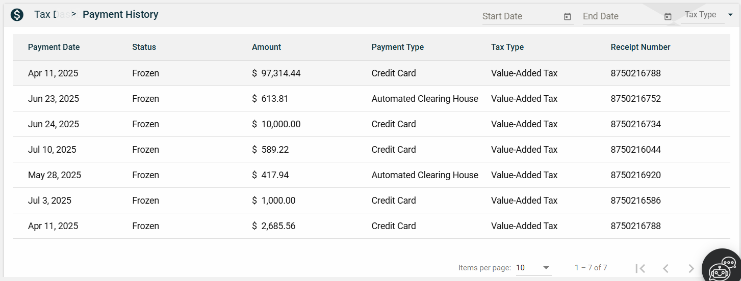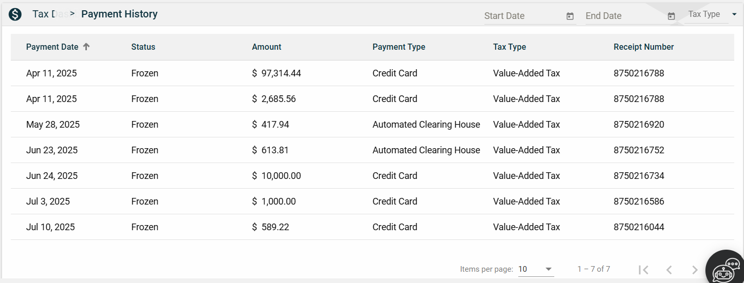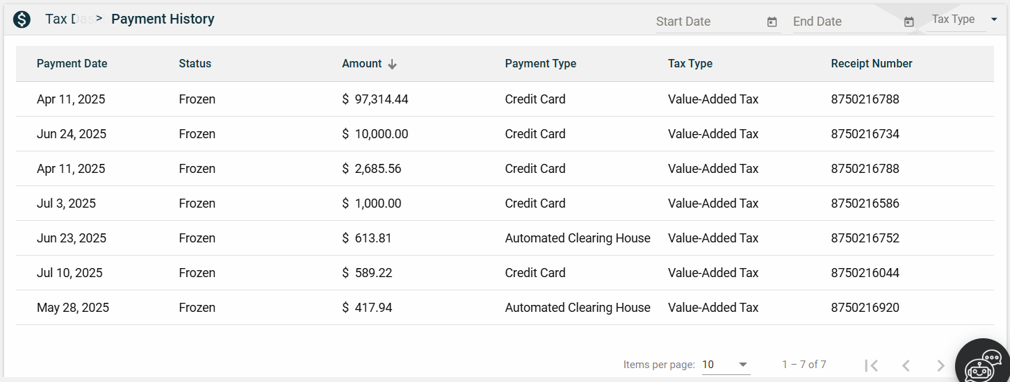 The Payment History page allows you to filter transactions by date or tax type.