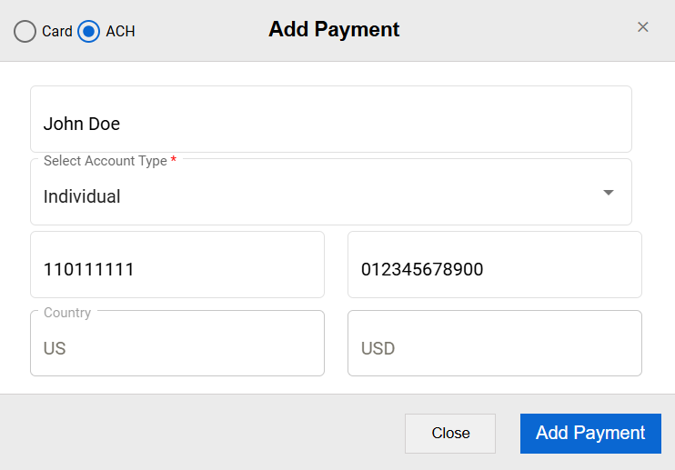 To add a new payment option, click Add New Payment Option button. You can add a credit card or an ACH.