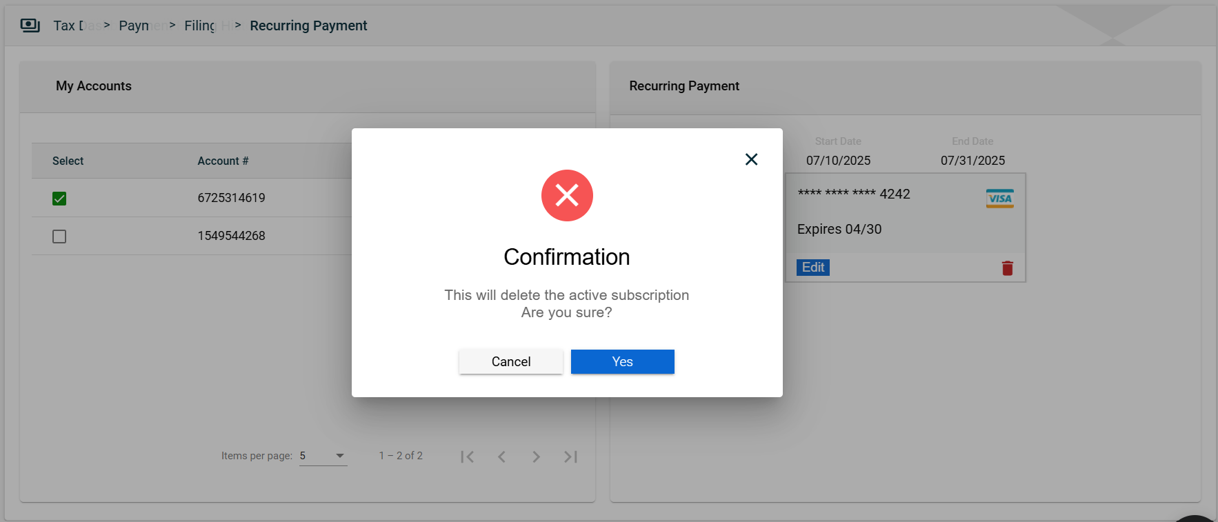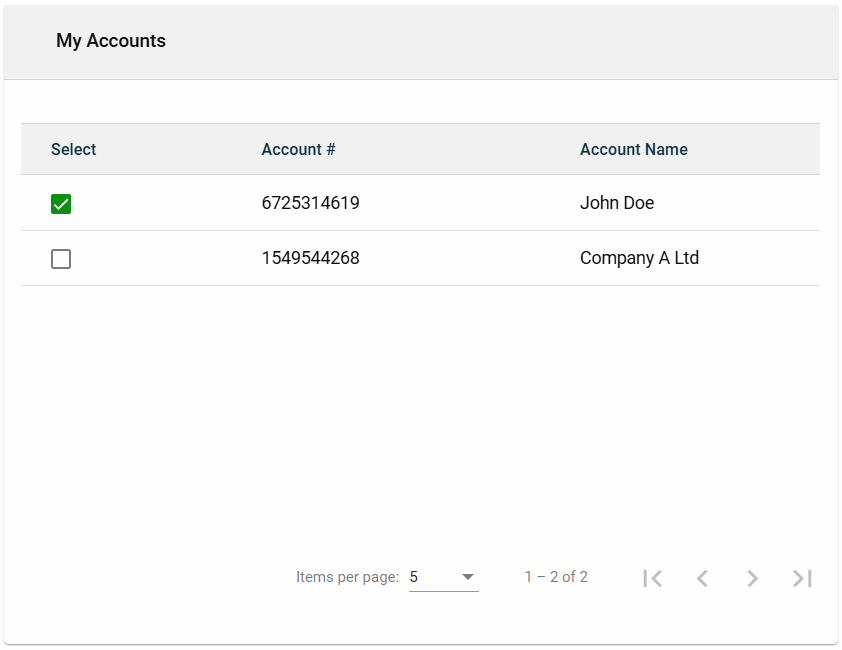 The My Accounts section displays the accounts associated with your email address. To select an account and view the recurring payment, tick the checkbox.