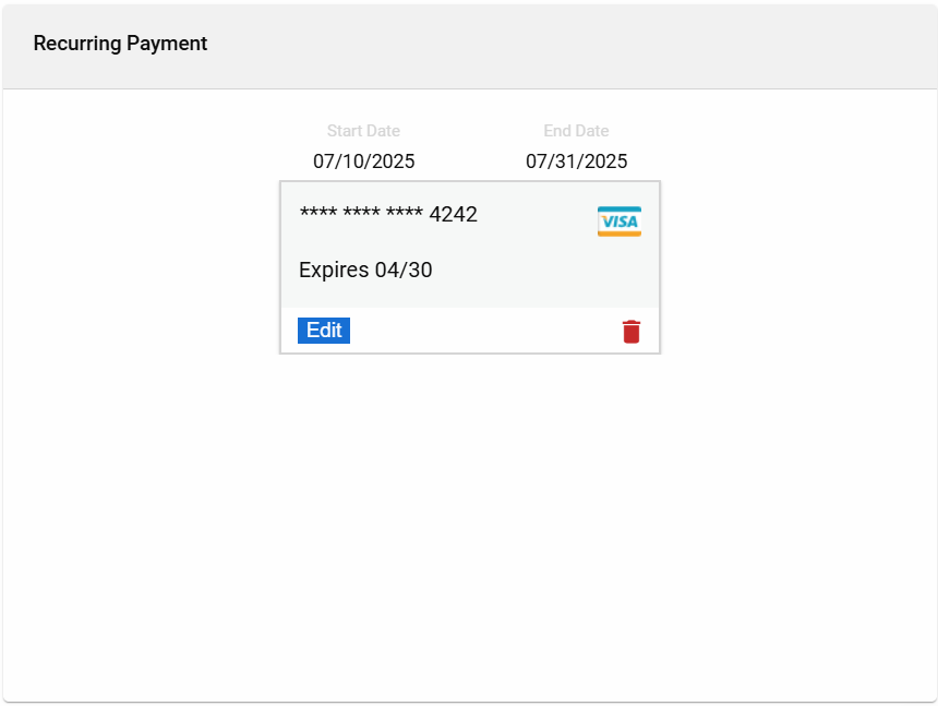To modify a configured payment option for a recurring payment, click the Edit button. Then, modify the fields you need to update. If you wish to add a new payment option, see Add a new payment option.