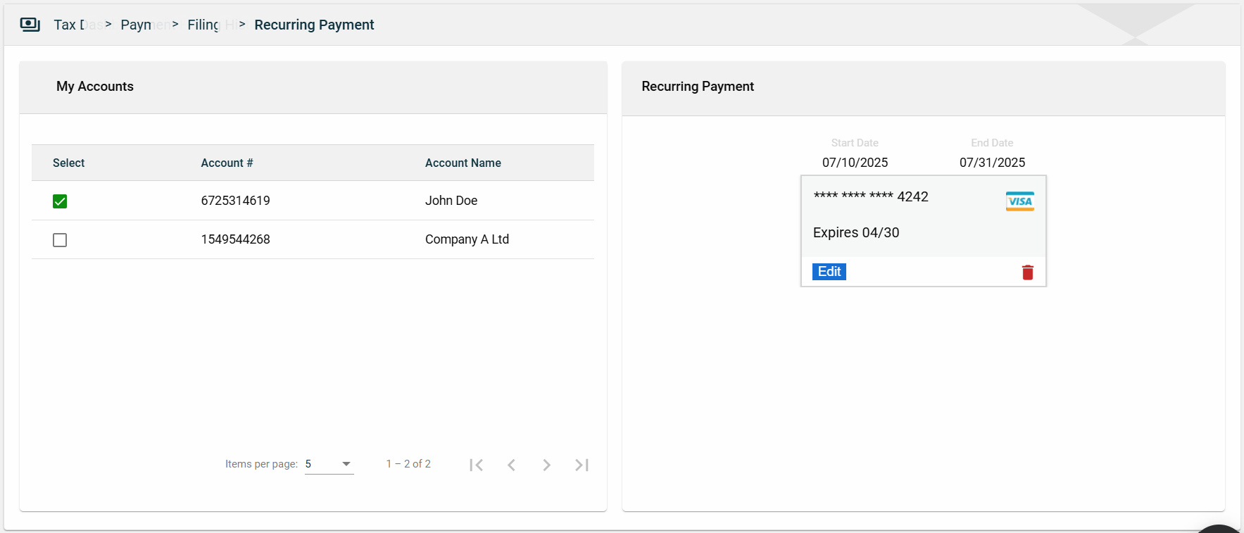 The Recurring Payments page provides an overview of your accounts and their associated recurring payments. You can choose to add either a credit card or ACH payment method for your recurring payments. This page also enables you to set up autopay for your accounts.