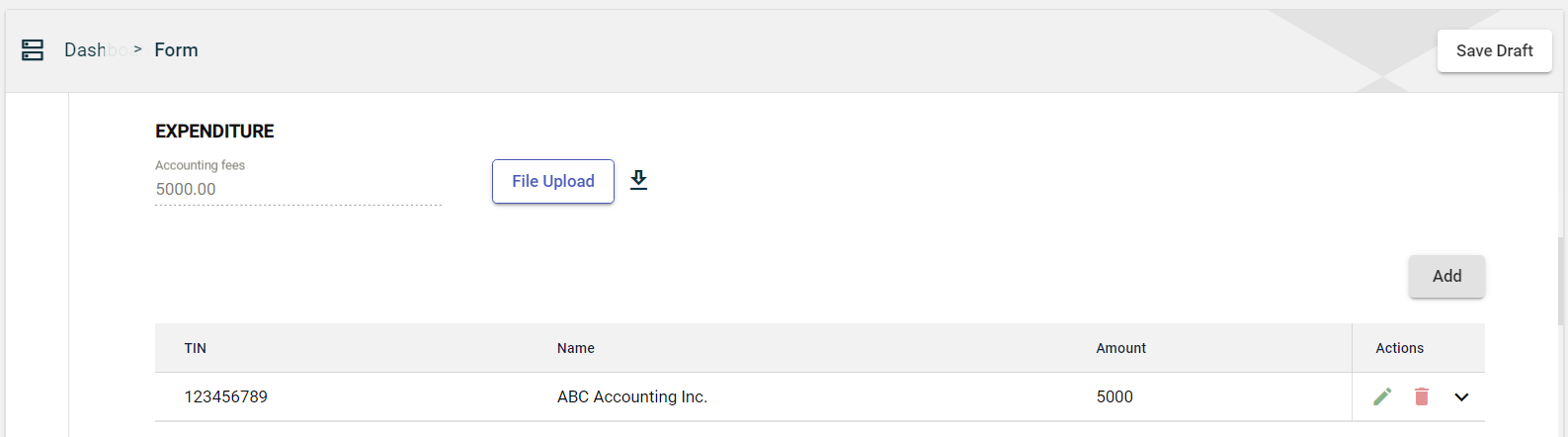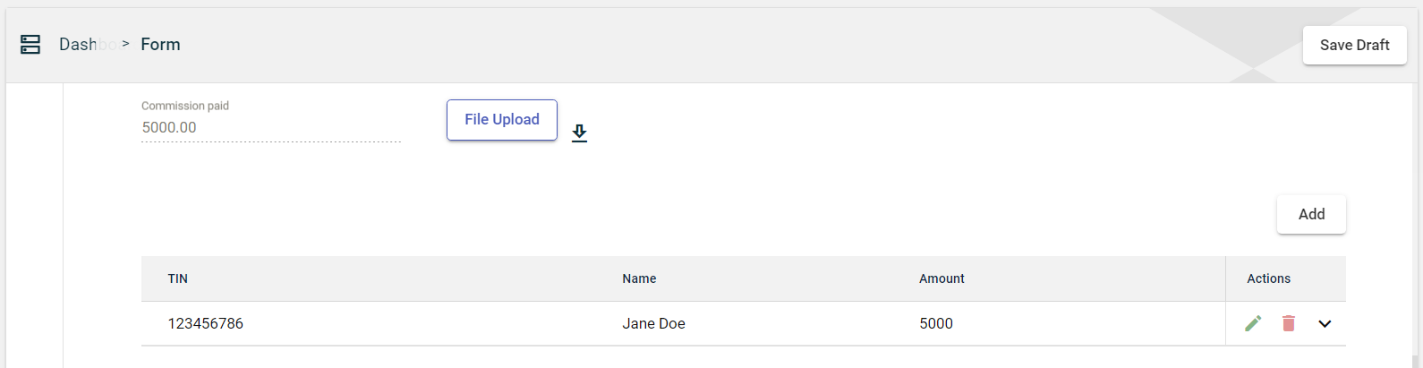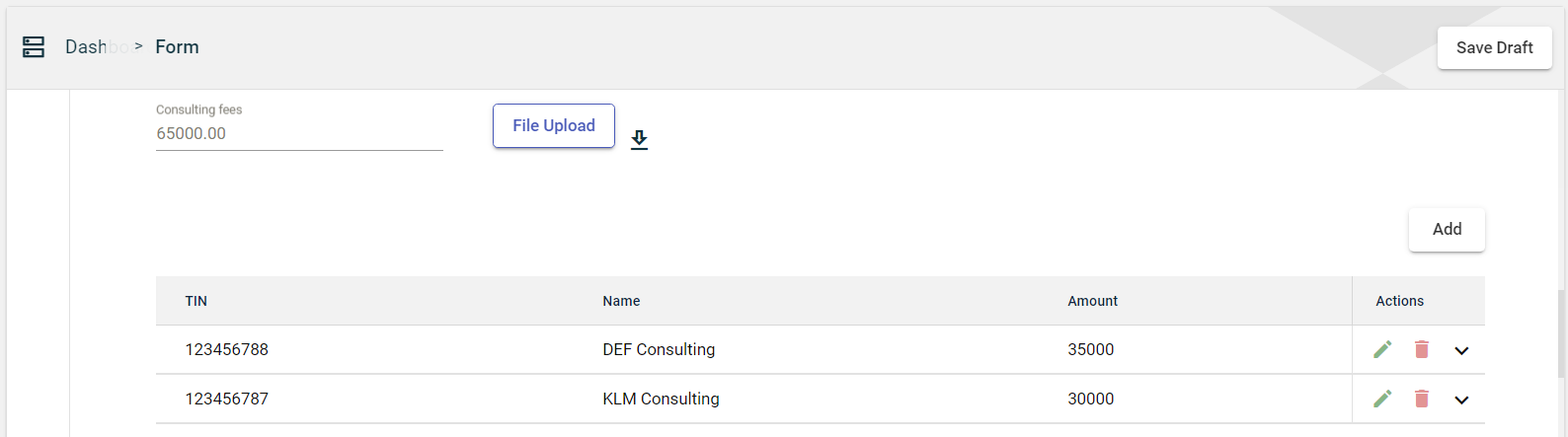 Once you have added an item, it will be displayed in a table. Each item will have its own row, displaying the TIN, company name, and amount. To edit the details, click