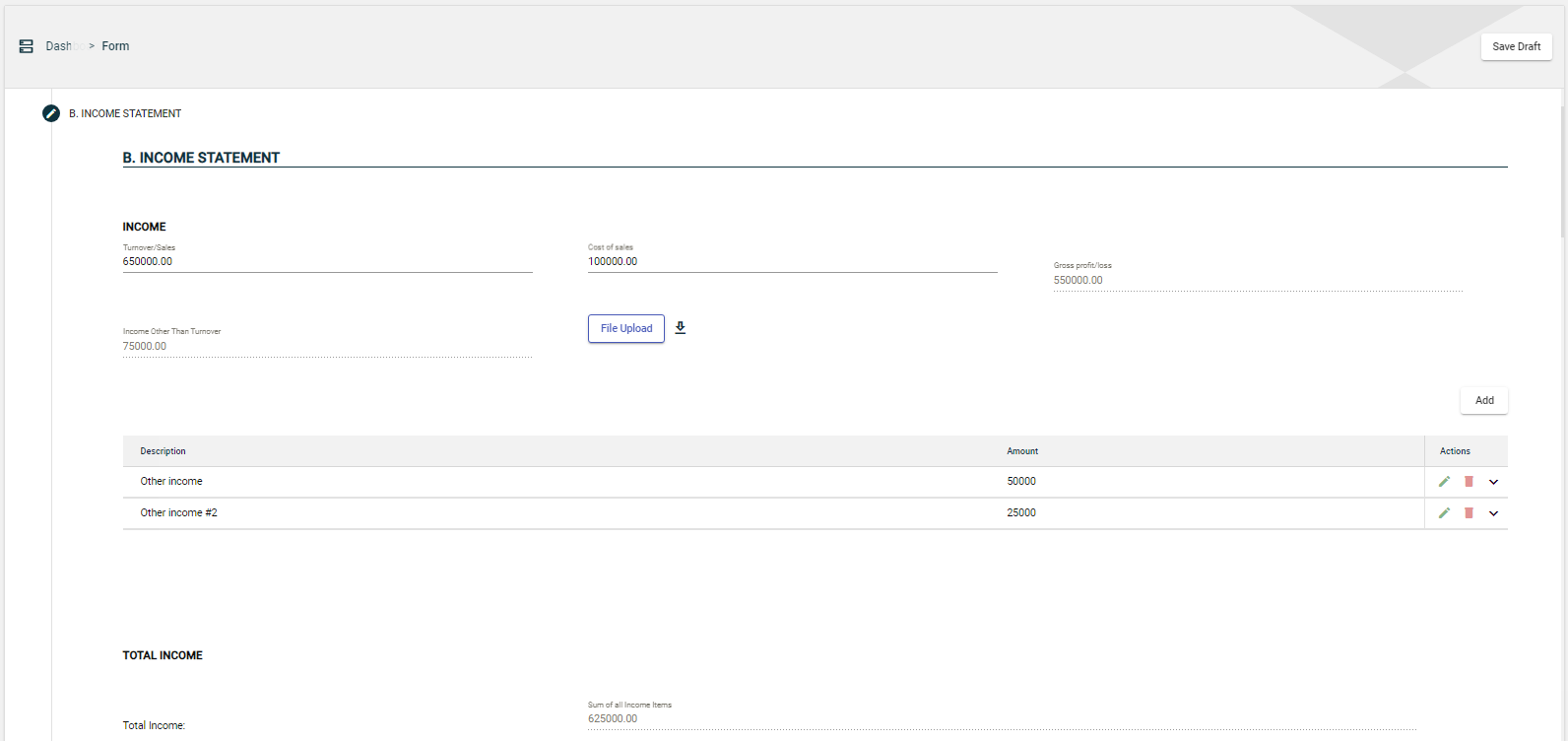The total value of all the added income is displayed in the Income Other Than Turnover field of the INCOME section.