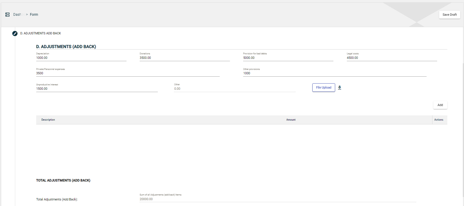 The Total Adjustment (Add Back) field is automatically populated with the sum of all add-back adjustment items.