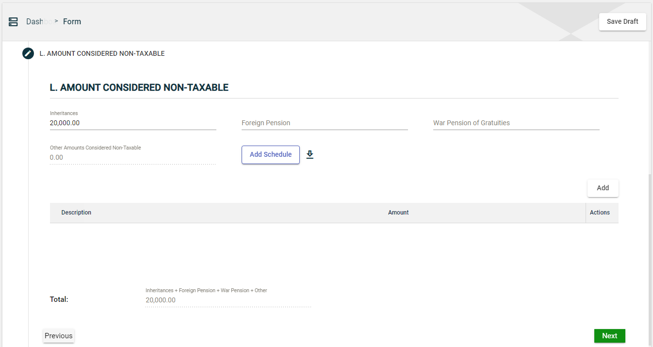 The total value of all the added amounts considered non-taxable is displayed in the Other Amounts Considered Non-Taxable field. You can edit the details by clicking