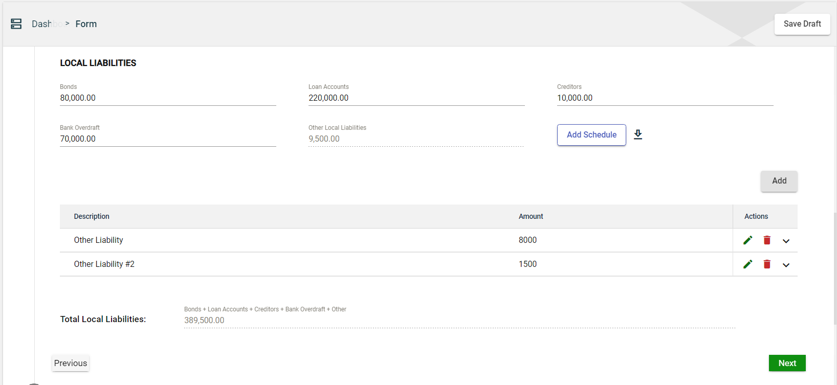 The Total Local Liabilities field is automatically filled with the total value of liabilities entered in the LOCAL LIABILITIES section.