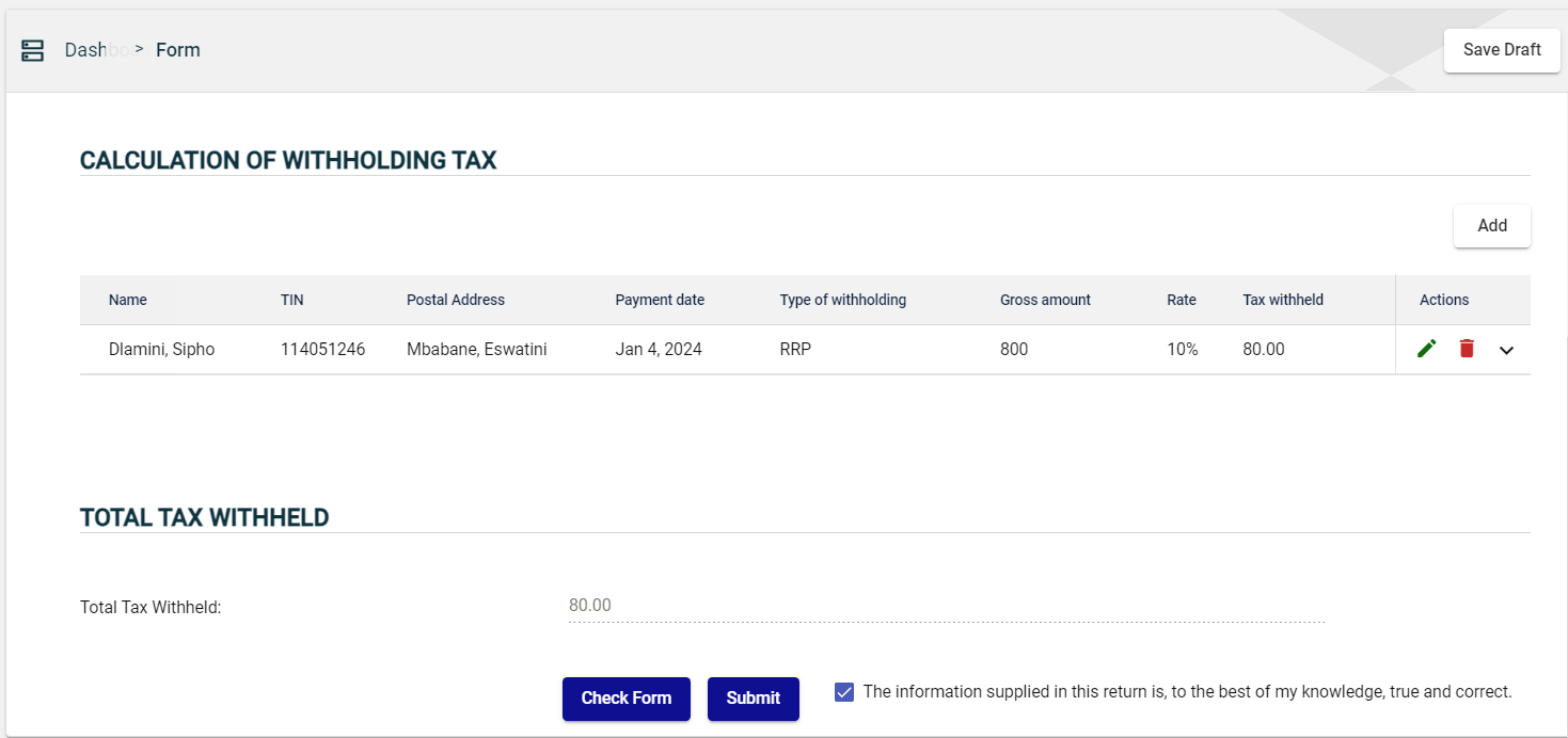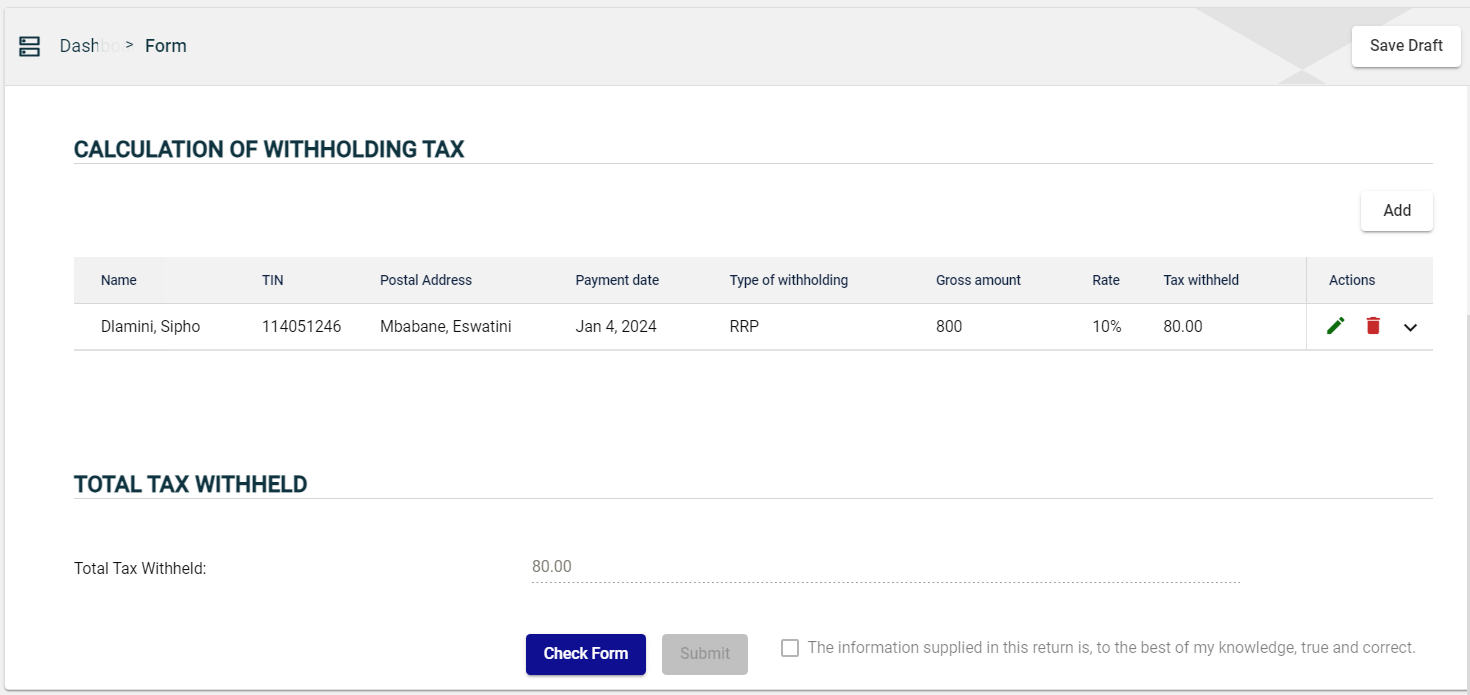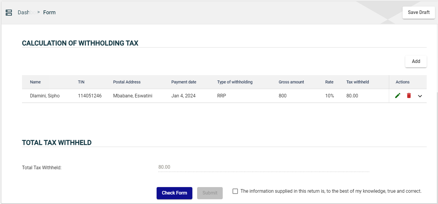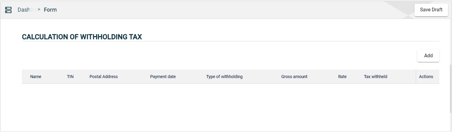 Click the Add button in the CALCULATION OF WITHHOLDING TAX section. There is no limit to the number of rows.\