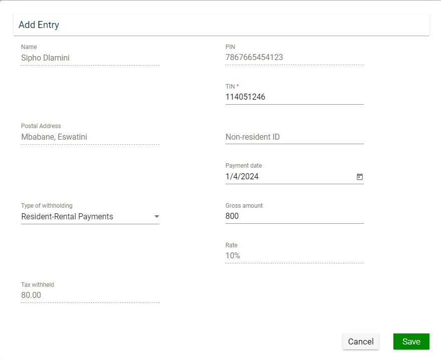 A row will be added to the CALCULATION OF WITHHOLDING TAX section. The Rate column is automatically populated depending on the withholding type. The Tax withheld column is computed based on the Rate value.