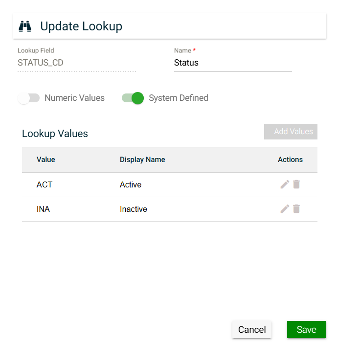 | Add Values | Allows you to add lookup values for lookup fields that are not system-defined. This button is disabled for lookup fields that are system-defined. |