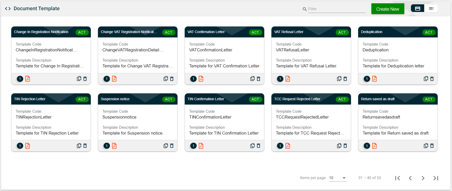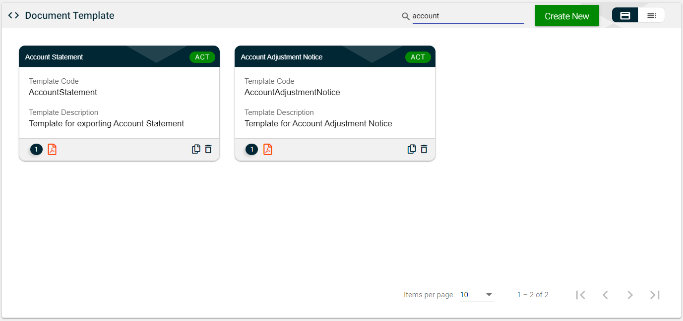 The card view presents all templates as individual cards. Each card header shows the template name along with its status. The card body includes the Template Code and Template Description. In the card footer, you will find the version number of the template, the document type, an icon for duplication, and an icon for deletion.