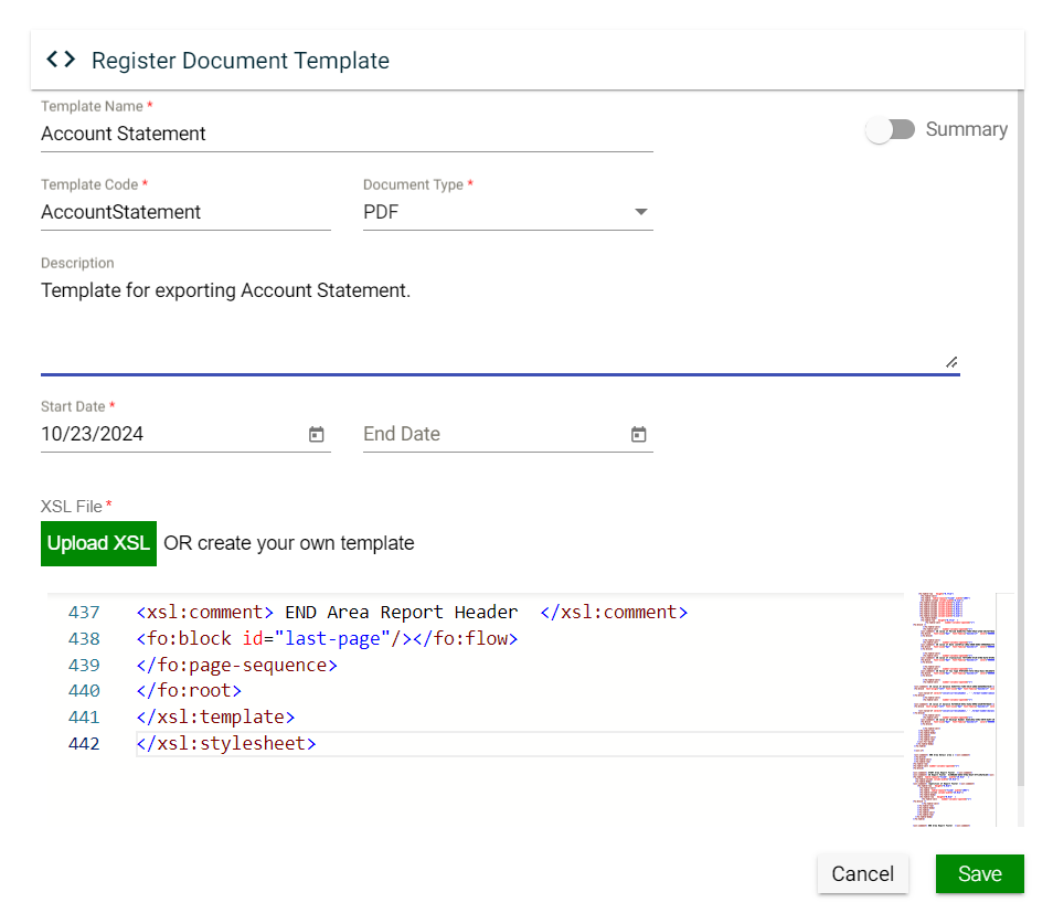 | XSL File | Allows you to upload an XSL file or create your own template. | |