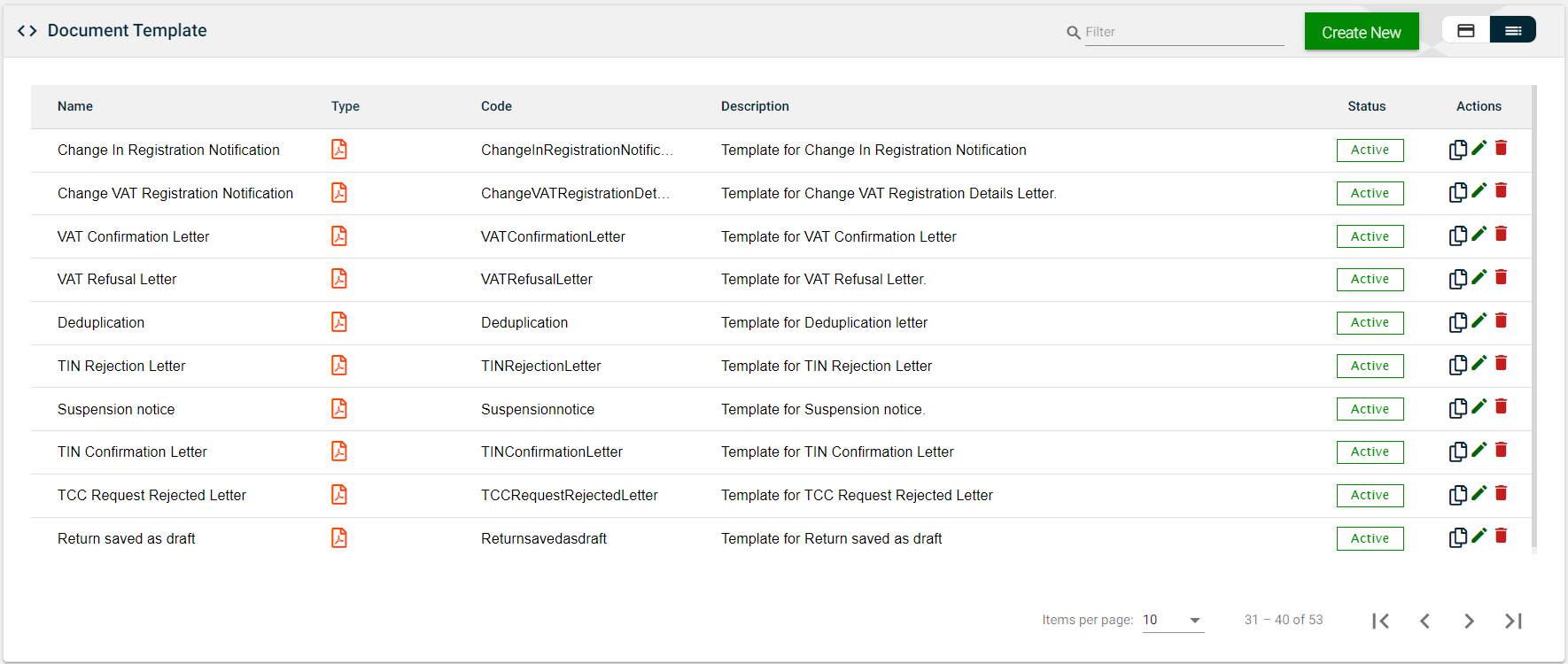 The Document Template module lists all available templates that can be used for document generation. The module allows you to add, modify, or delete templates.