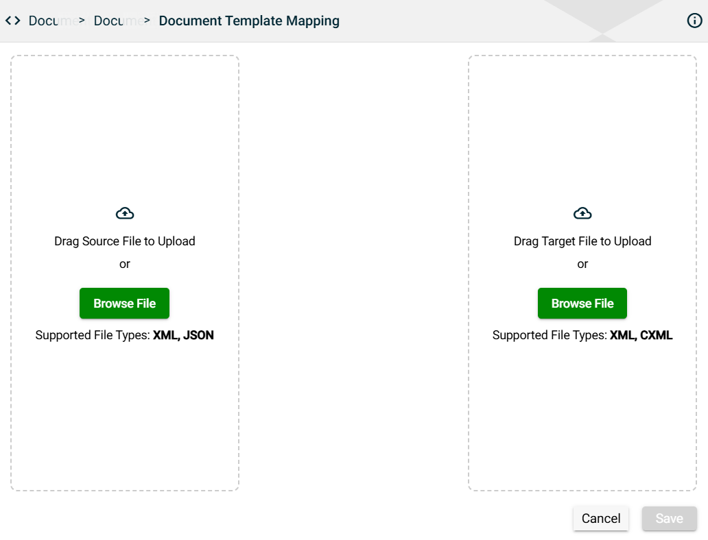 When you modify a template, you can configure the mapping by clicking the Mapping button located in the upper-right section. This will bring up a new screen where you can upload the source and target files in either XML or JSON format. After uploading the files, click Save to confirm your changes.