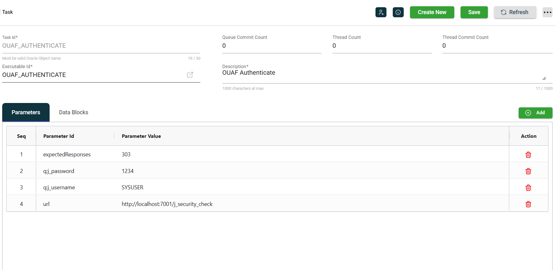 AUTHENTICATE does not have a specified chainedTask parameter, so it is the end of the authentication chain. This specifies the q:j_password, q:j_username, and URL to log into the application. The q: parameters are sent as request parameters in the HTTP call. An expectedResponse (303) parameter is also defined that is checked after the call. Multiple responses can be specified as a comma-delimited list. For example, 302,303. The task will fail if the response code does not match the expectedResponse defined value.