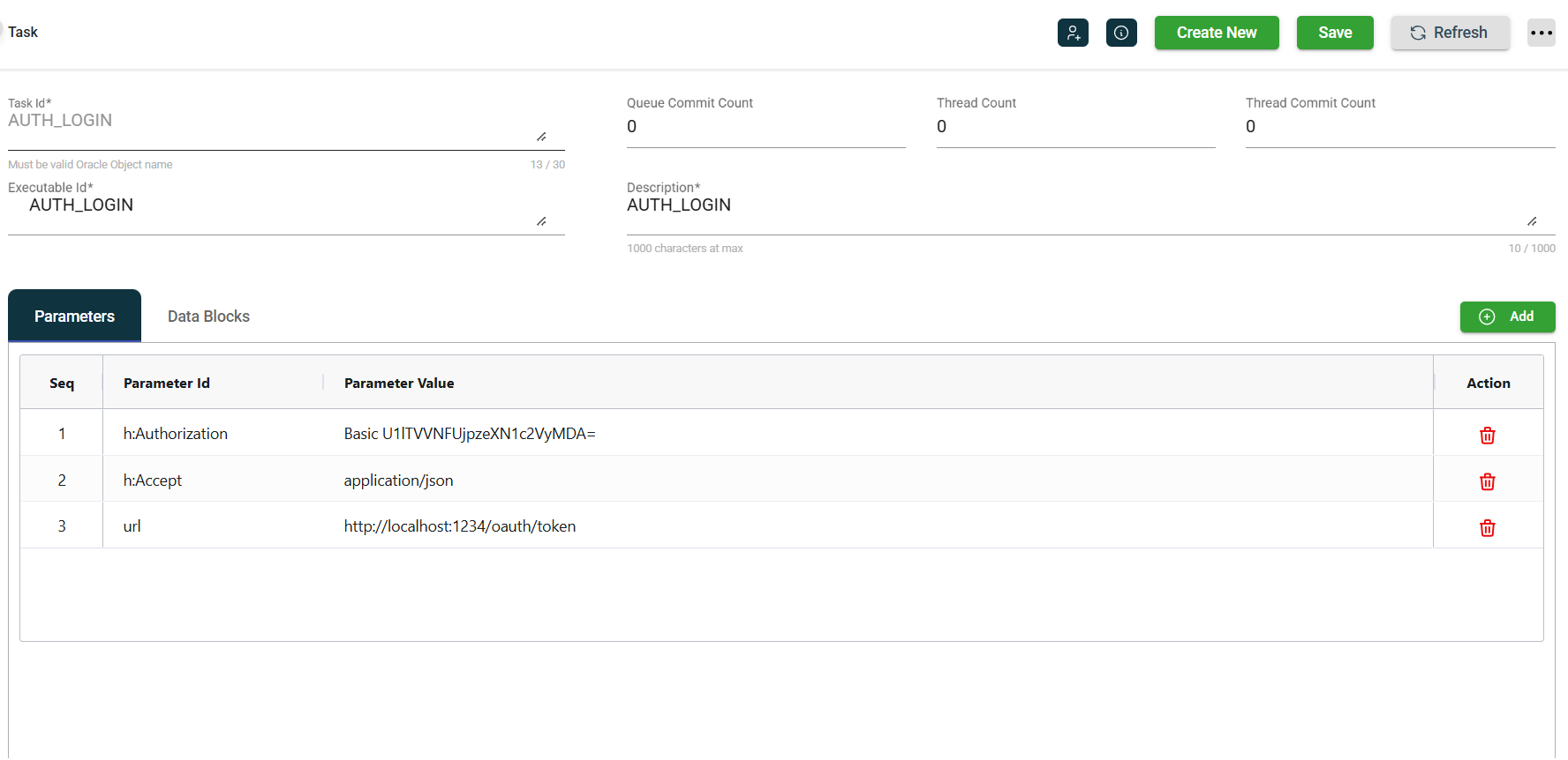 As shown below, the AUTH_LOGIN task calls http://localhost:1234/oauthToken and specifies the base64 encoded basic credentials in the h:Authorization parameter.
