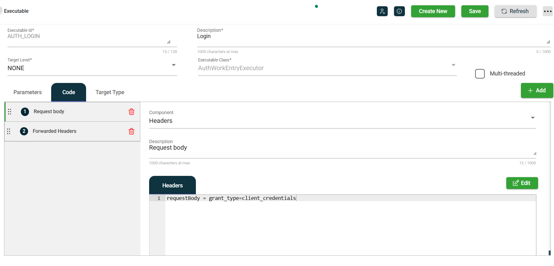 The REST_TOKEN executable will use the cookies from the call to AUTHENTICATE to make its call to restSecurityToken. Its executable Code Block defines the additional values for its token request.