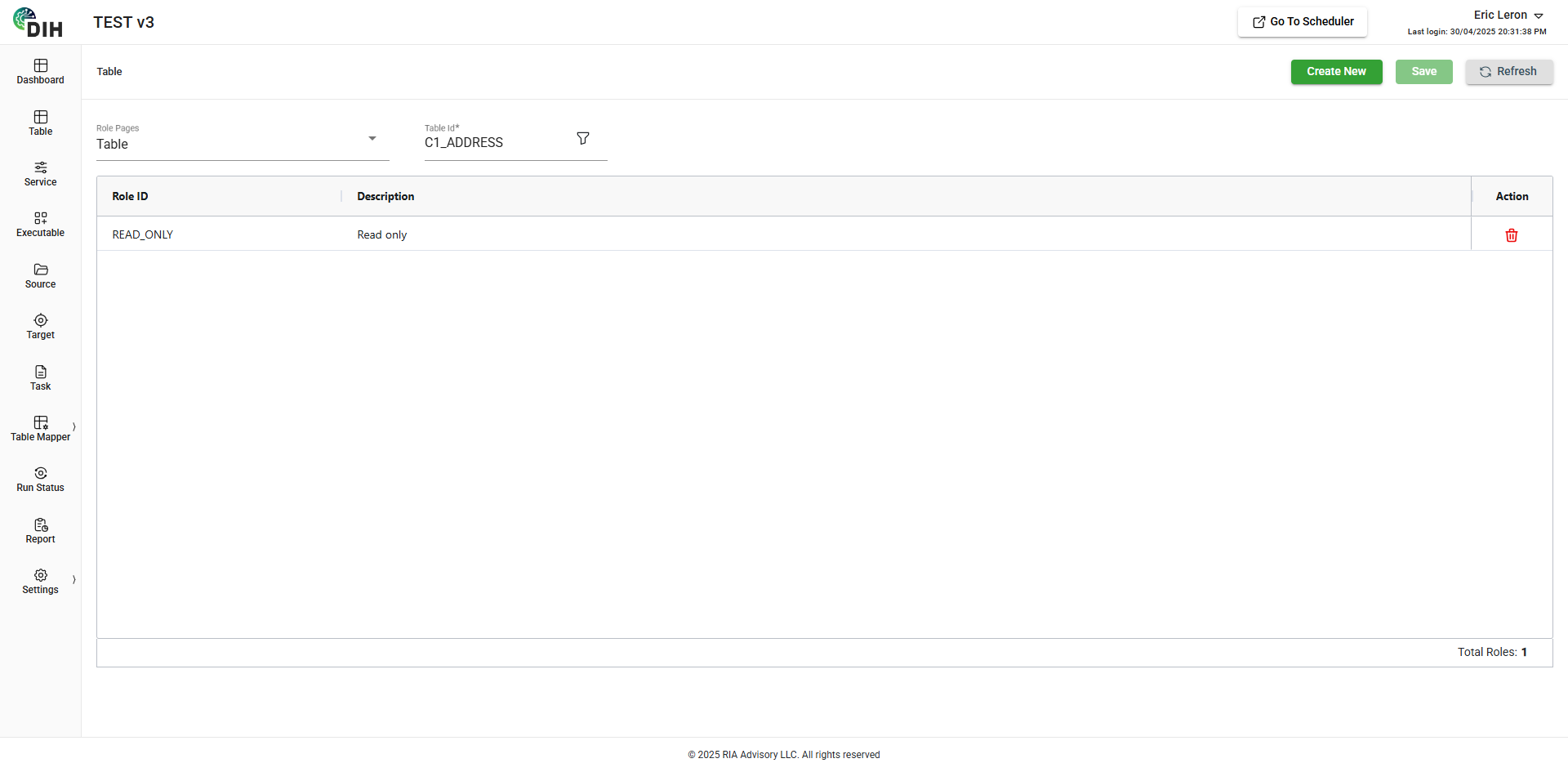 The Roles Page allows you to manage the roles of an entity like Table, Service, Executable, etc. For example, the C1_ADDRESS table has a READ_ONLY role.