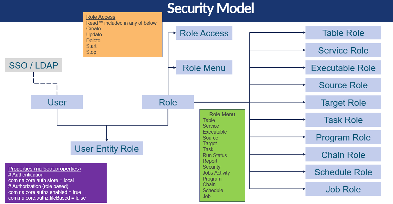 Note that the authorization as described below is only in effect if the ria-boot.properties have been specified as shown in the purple block, bottom-left of the diagram.