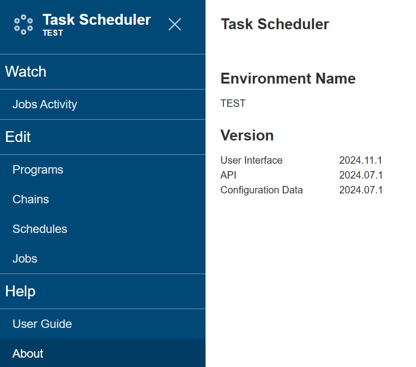 - About — The About section displays the environment name and latest version of the user interface, API and configuration data of the task scheduler.