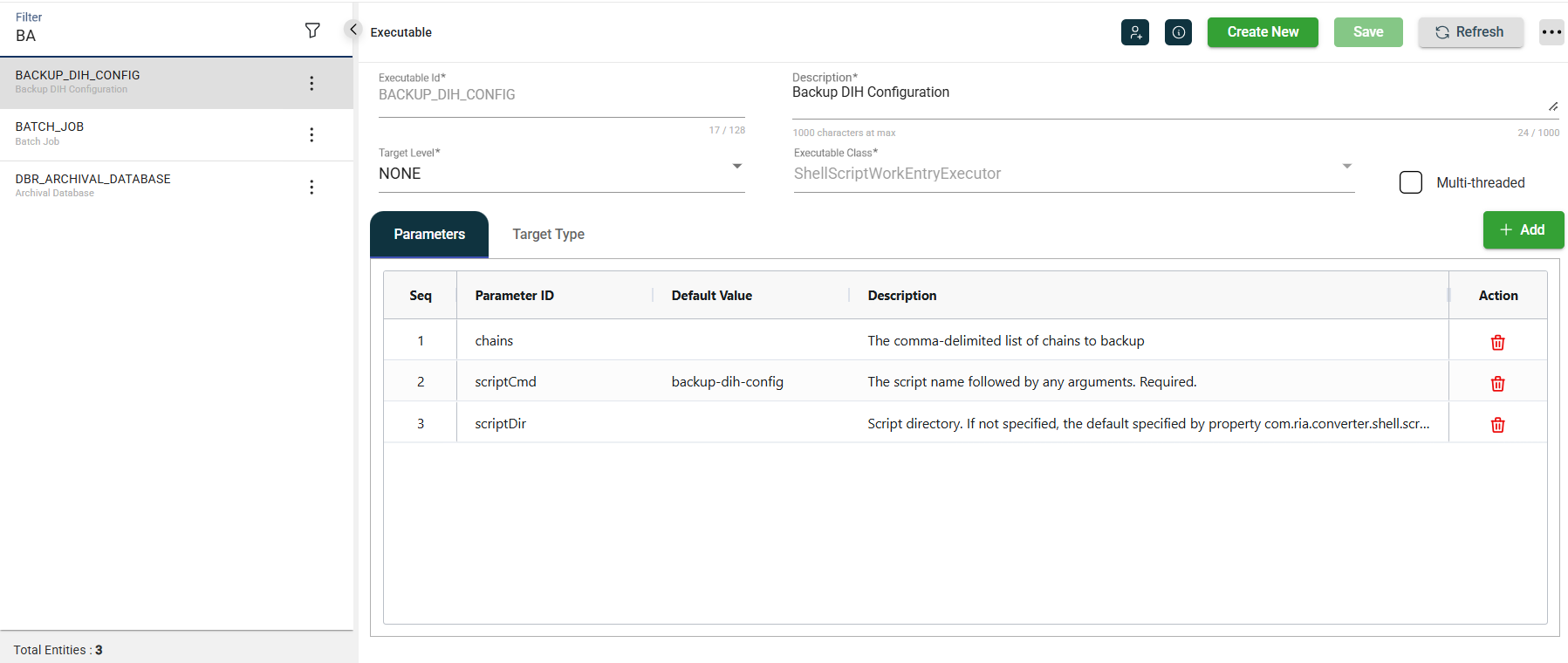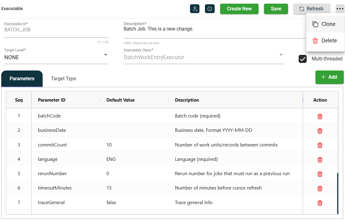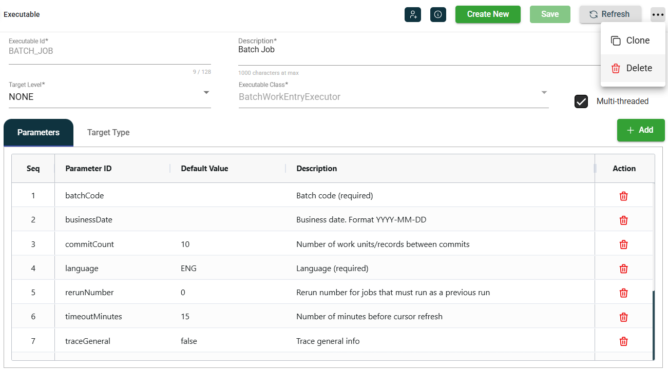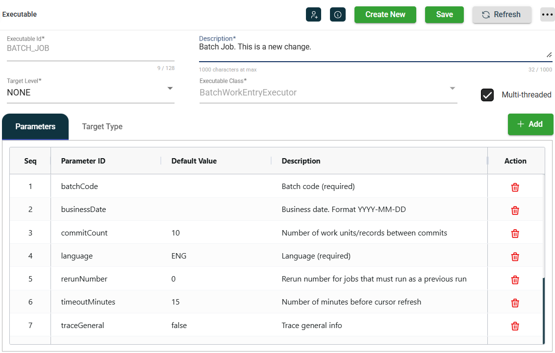 | Parameter | Parameters provide another control point for an executable. To add a new parameter, see Add a parameter. |