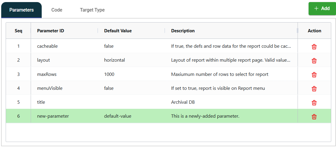 A newly added parameter will be highlighted in green. Once you click Save, the highlight will disappear.