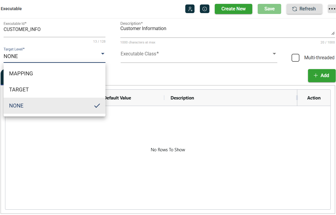 | Multi-threaded | Enables multi-threading for the Java class. If multi-threading is enabled, the executable can be submitted to more than one thread. Ensure that the selected Java class can process data in multiple threads. Default: Disabled Mandatory: No |
