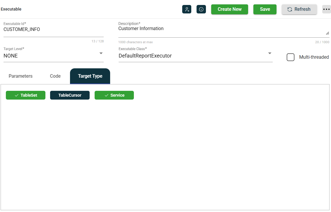 | Code | Supply any additional code blocks for an executable. For more information, see Code. This tab is only available for DefaultReportExecutor executable class. |