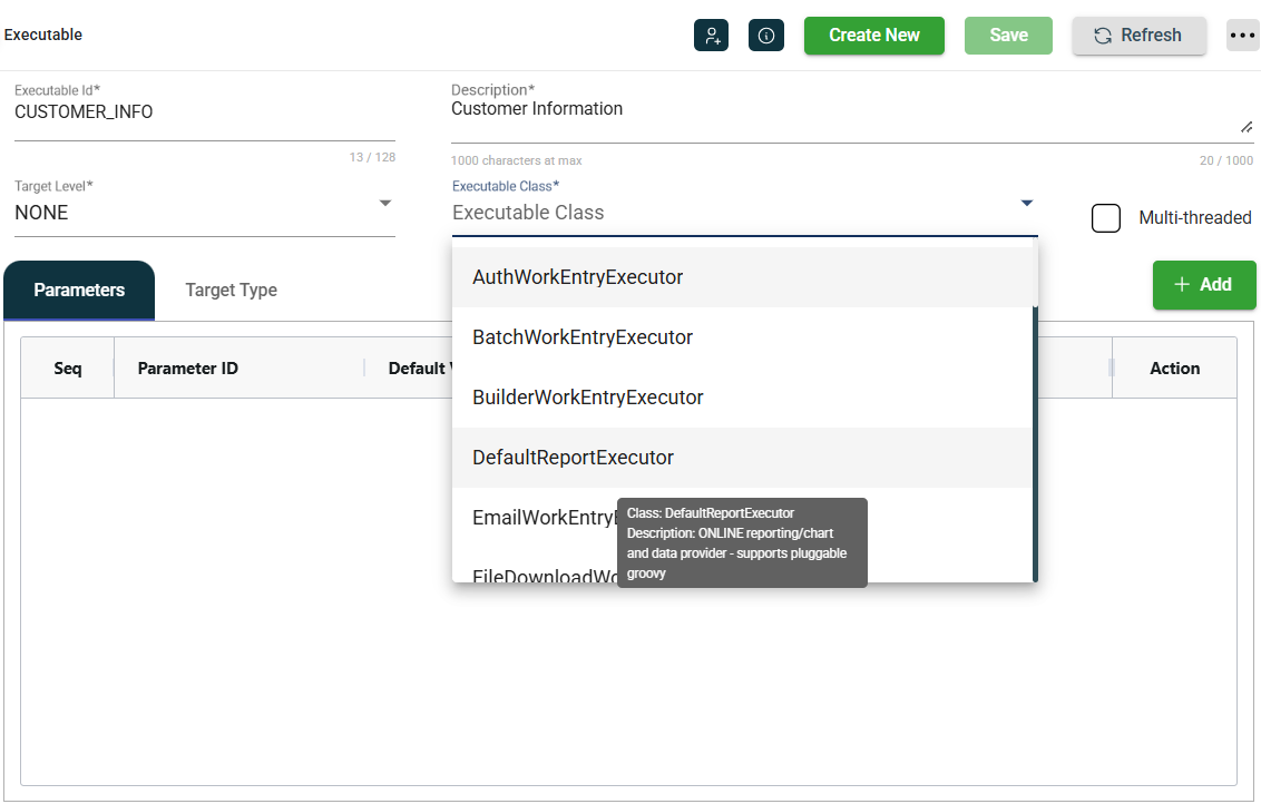 | Executable Class Name | Dropdown list of all available classes that are pre-defined or customized. For the list of provided classes, see Executable Classes for Task Execution. Mandatory: Yes |