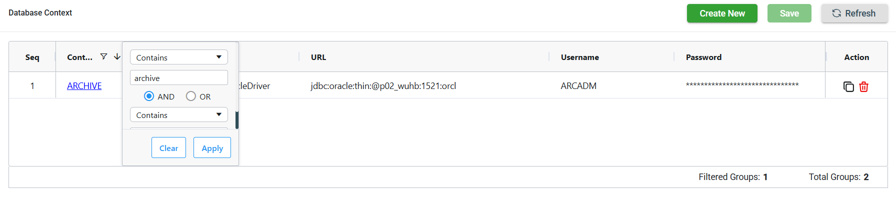 The Database Context includes a Filter feature that allows you to filter the list of database context by providing a keyword or the full name of the database context. The database context that matches the provided keyword or name will be displayed on the screen.