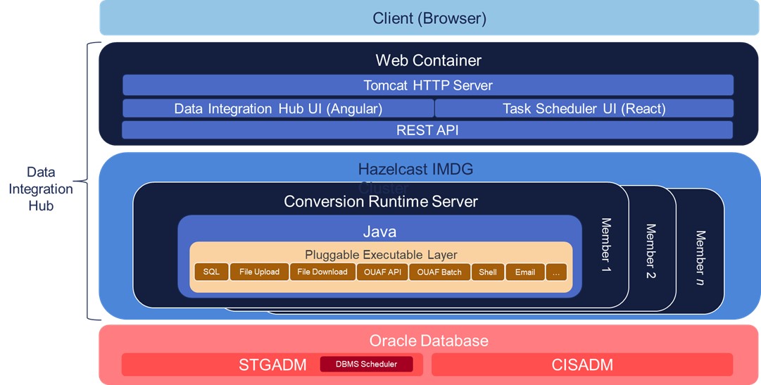 Data Integration Hub includes a single-page web application, which runs on a Tomcat HTTP container and is accessed through any modern browser (Chrome, Firefox, etc.) The web container hosts an Angular application, which renders the main UI for the tool, and a secondary React based application for the task scheduling integration. The details of this are described further in this guide. The REST API is the gateway to the server for the UI clients to perform the necessary CRUD and validation operations.