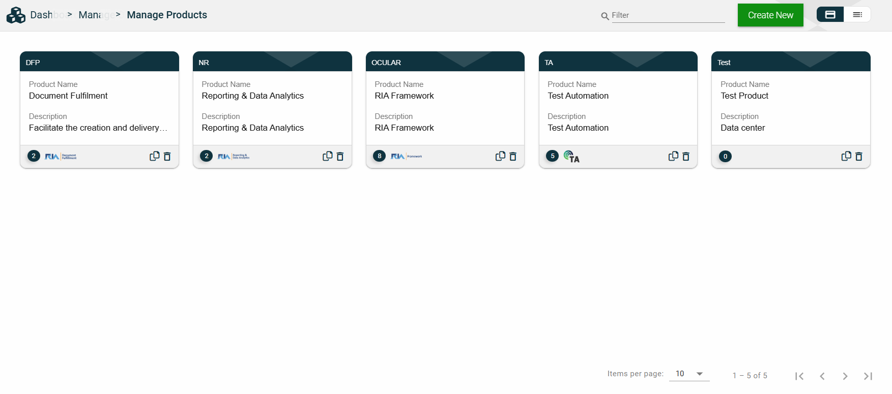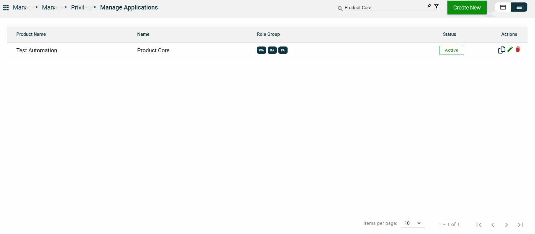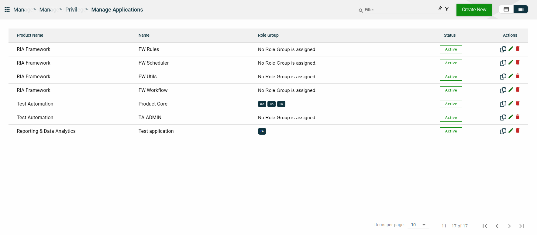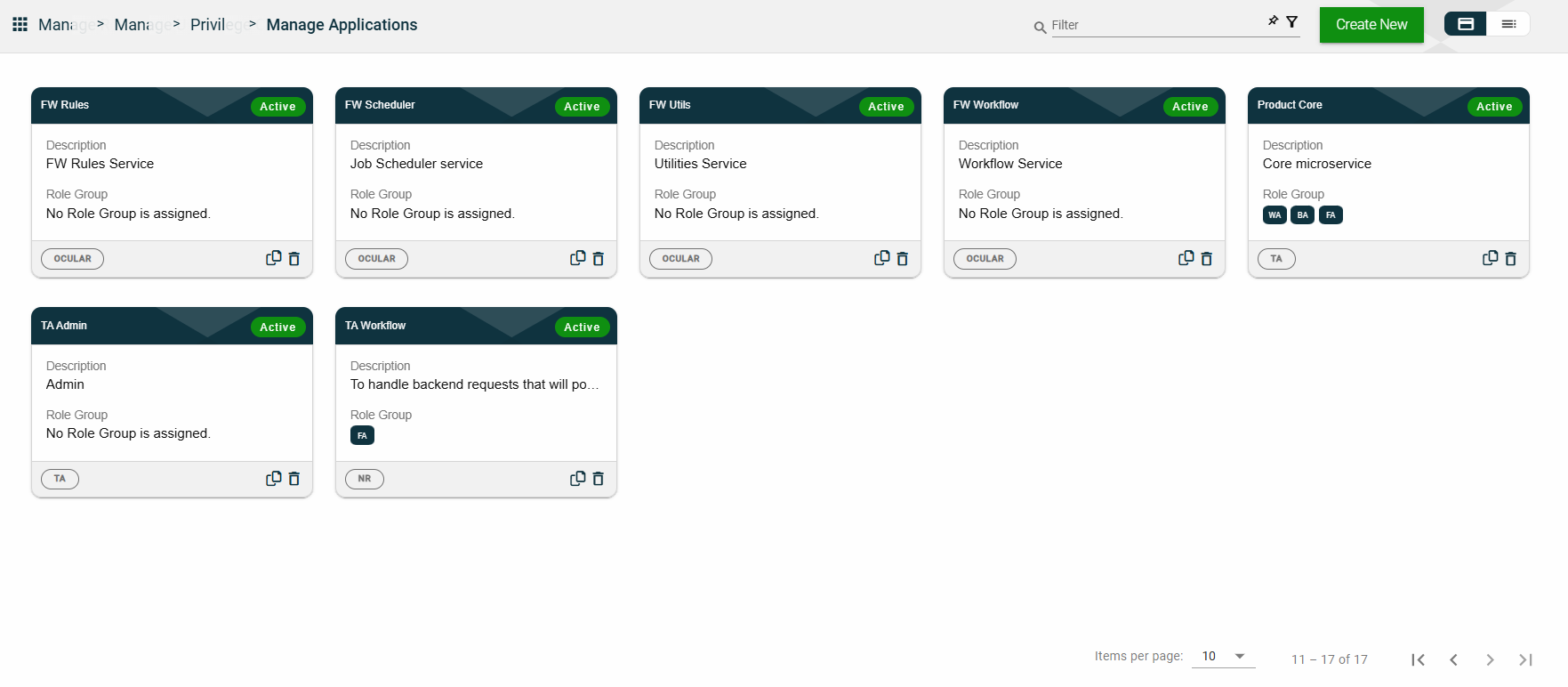 The card view presents all applications in the form of cards, with the application name and status on the card header. The card displays the Description, Role Group, and the configured authentication type. The card footer displays the product associated with the application, a duplicate icon, and a delete icon.