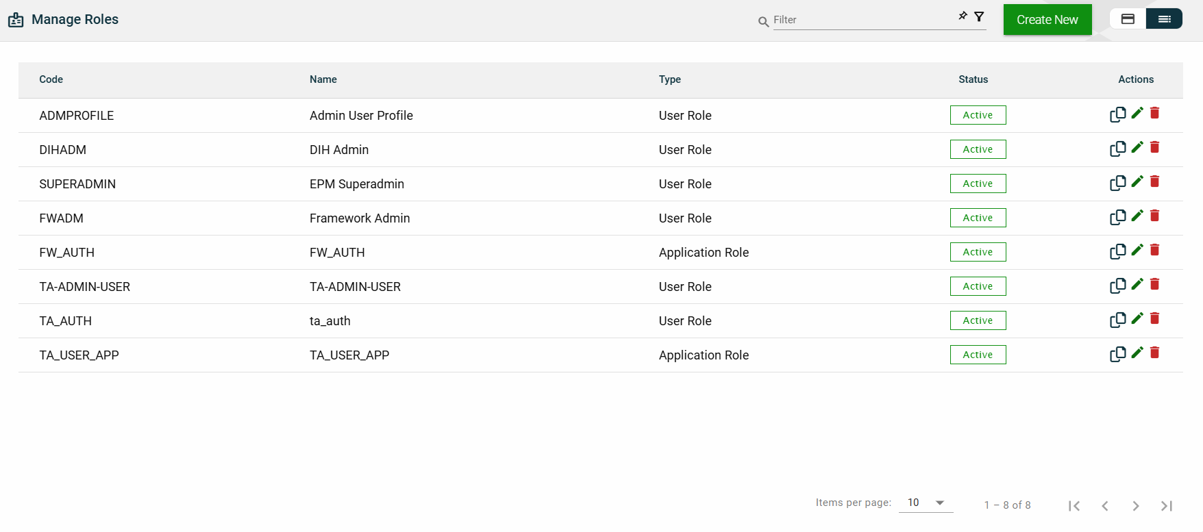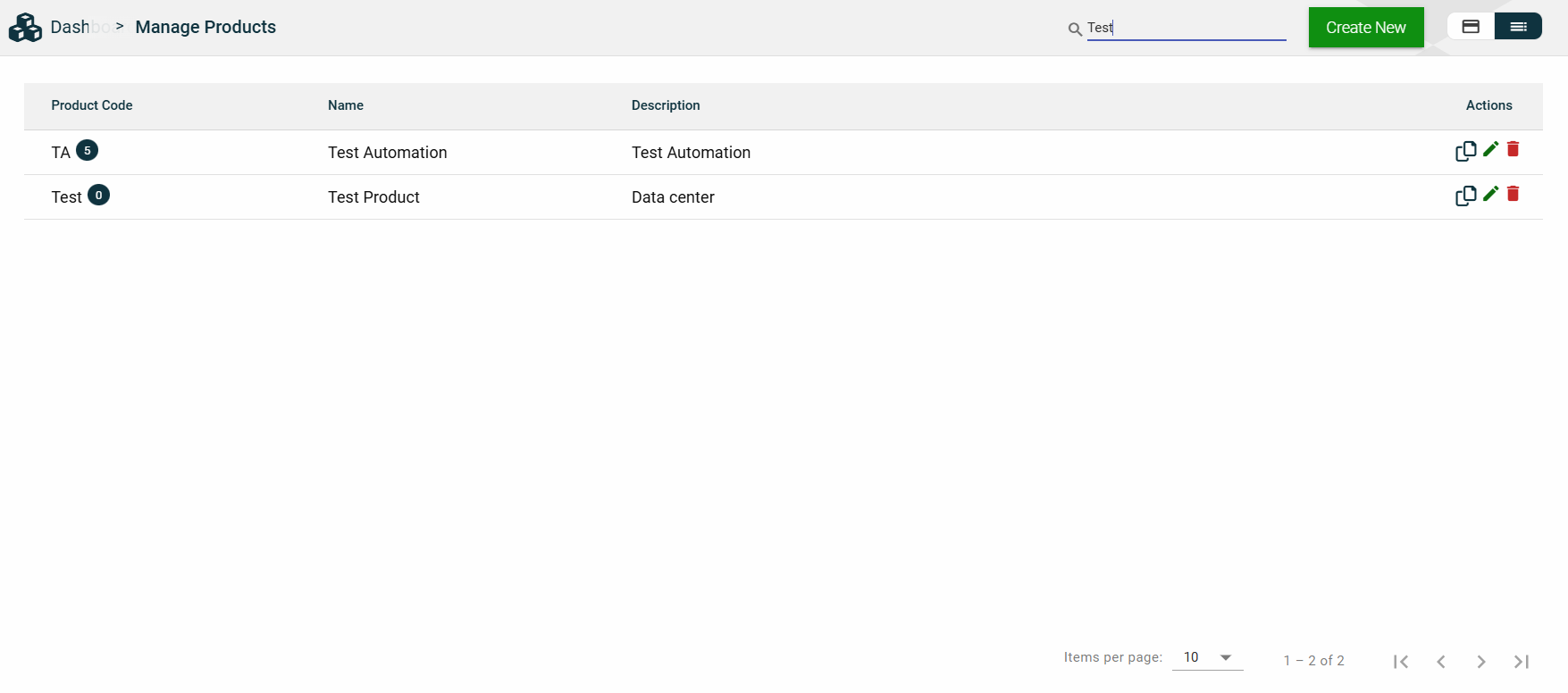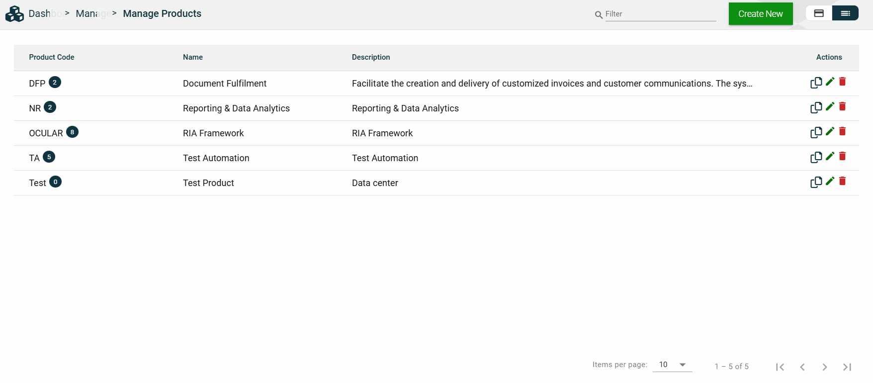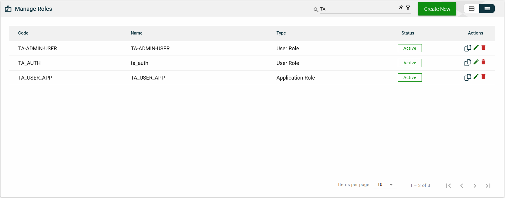 The card view presents all applications in the form of cards, with the application name and status on the card header. The card displays the Description, Role Group, and the configured authentication type. The card footer displays the product associated with the application, a duplicate icon, and a delete icon.