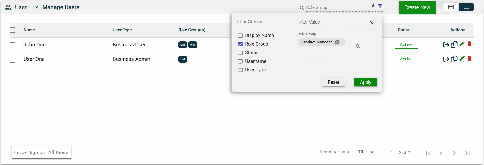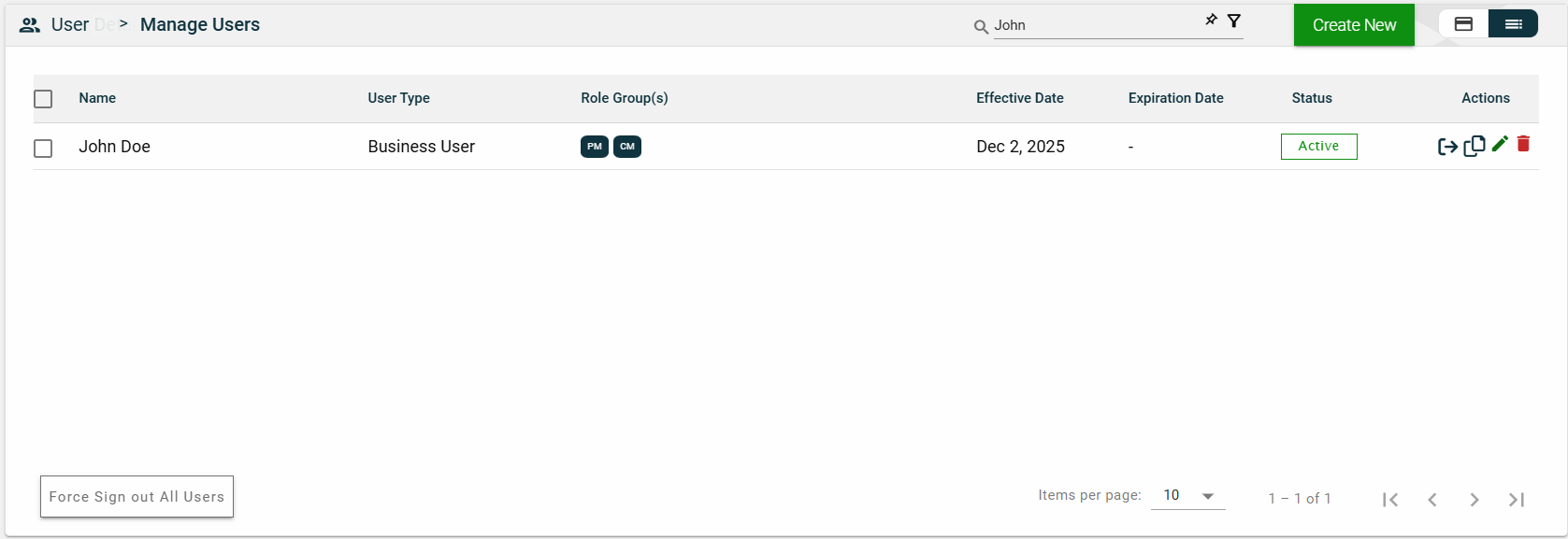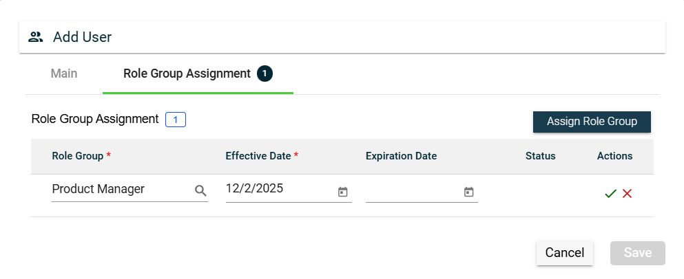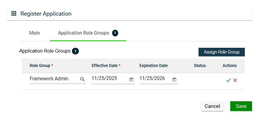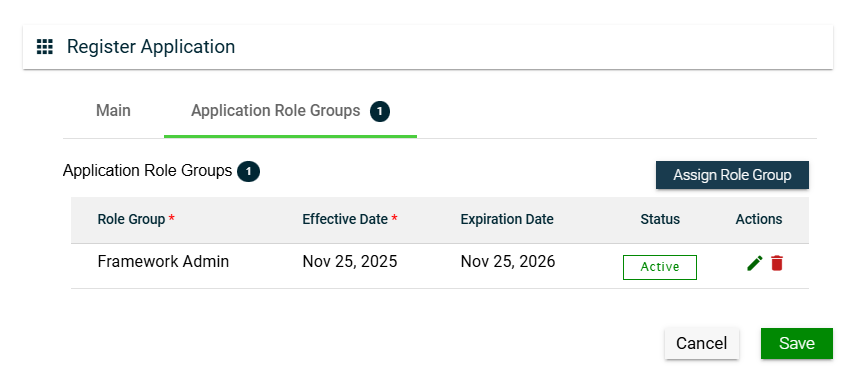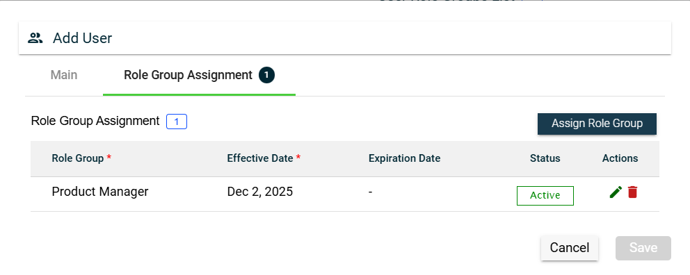 You can edit the effective and expiration dates of a role group. You can also delete a role group from the list by clicking .
