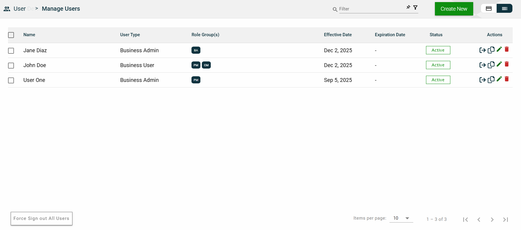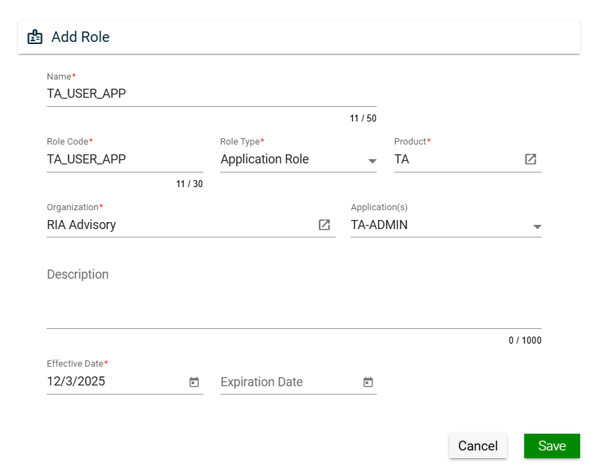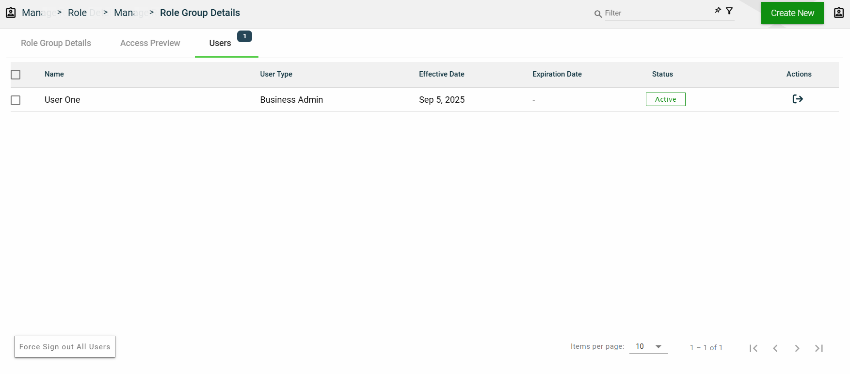 You can edit the effective and expiration dates of a role group. You can also delete a role group from the list by clicking .