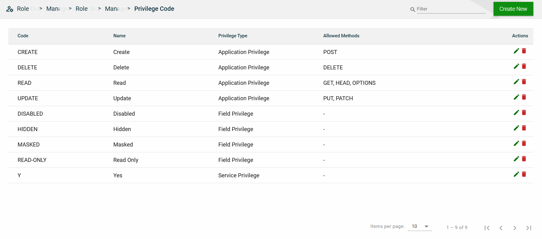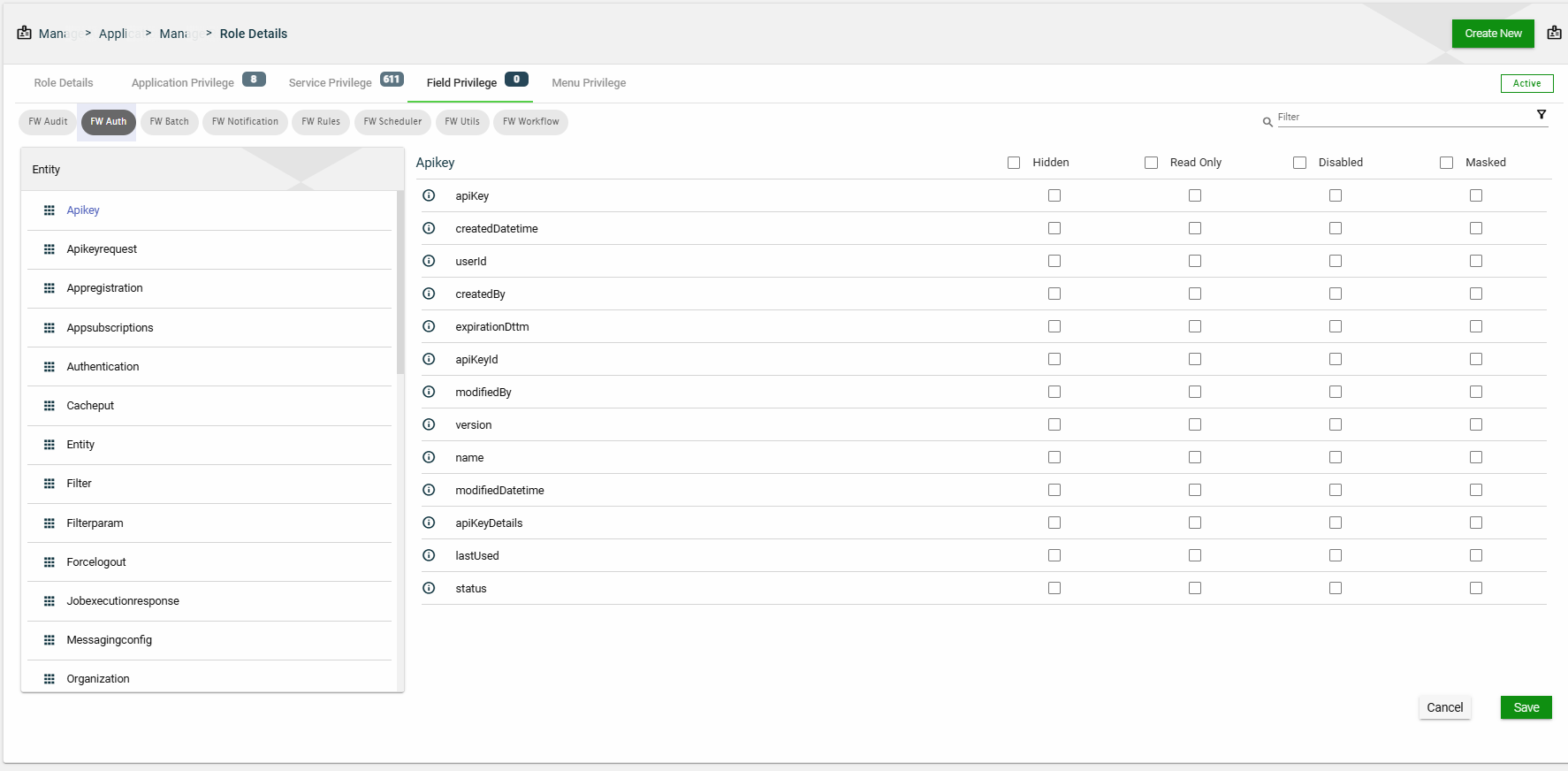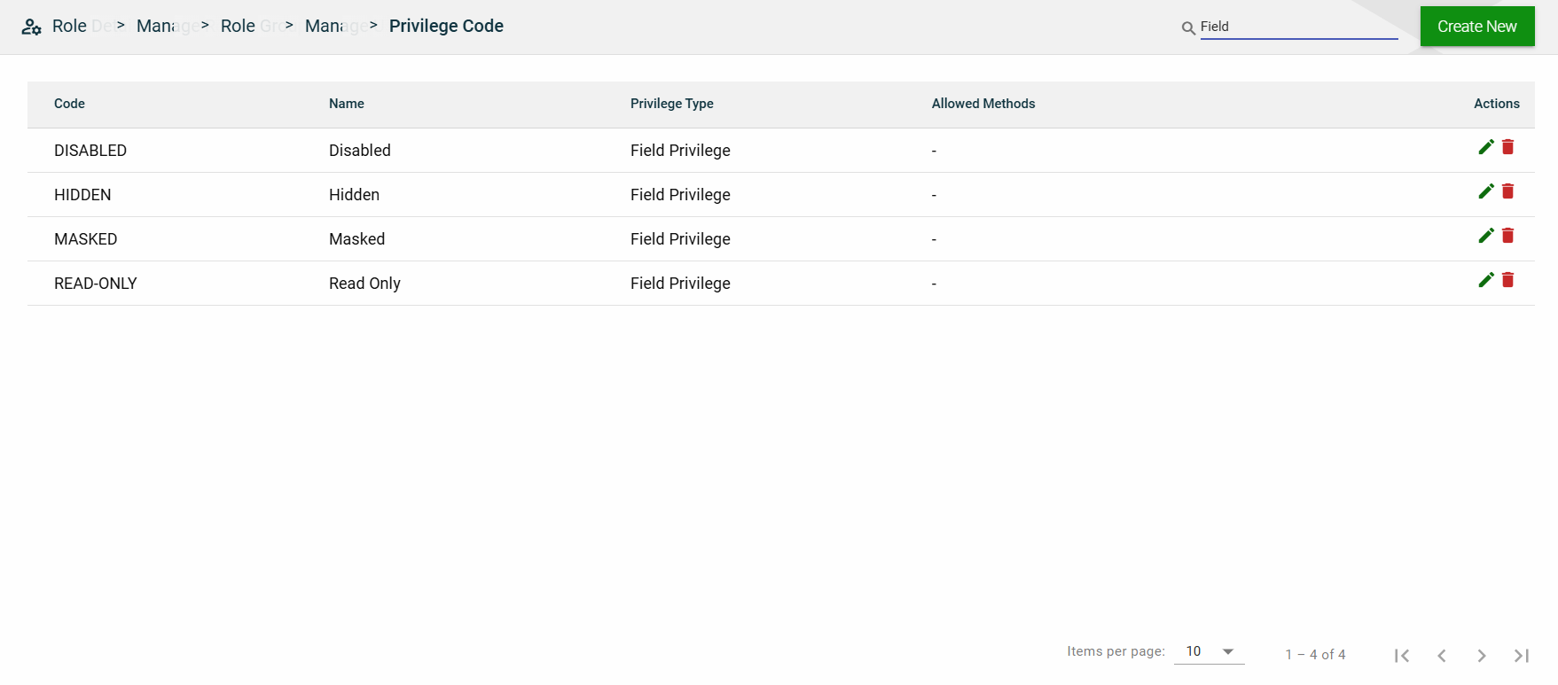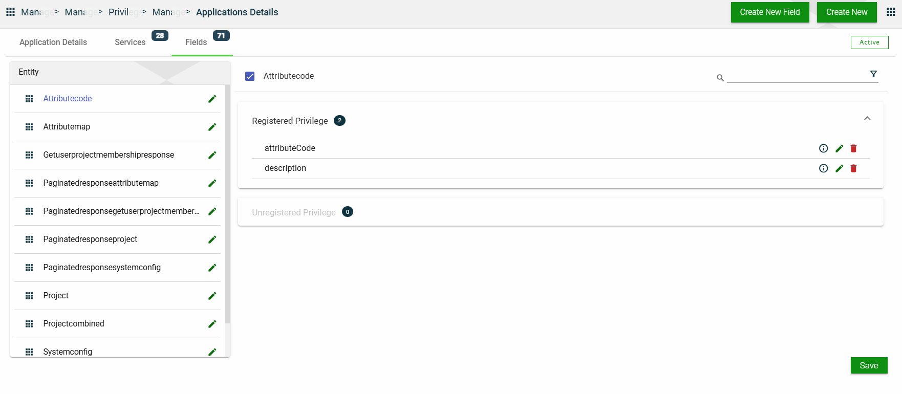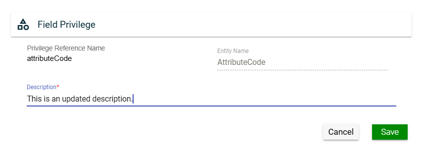 In this section, you can only edit the Entity Name field of an entity and the Description field of a field privilege by clicking the icon next to the item. You can also delete a field privilege by clicking .
