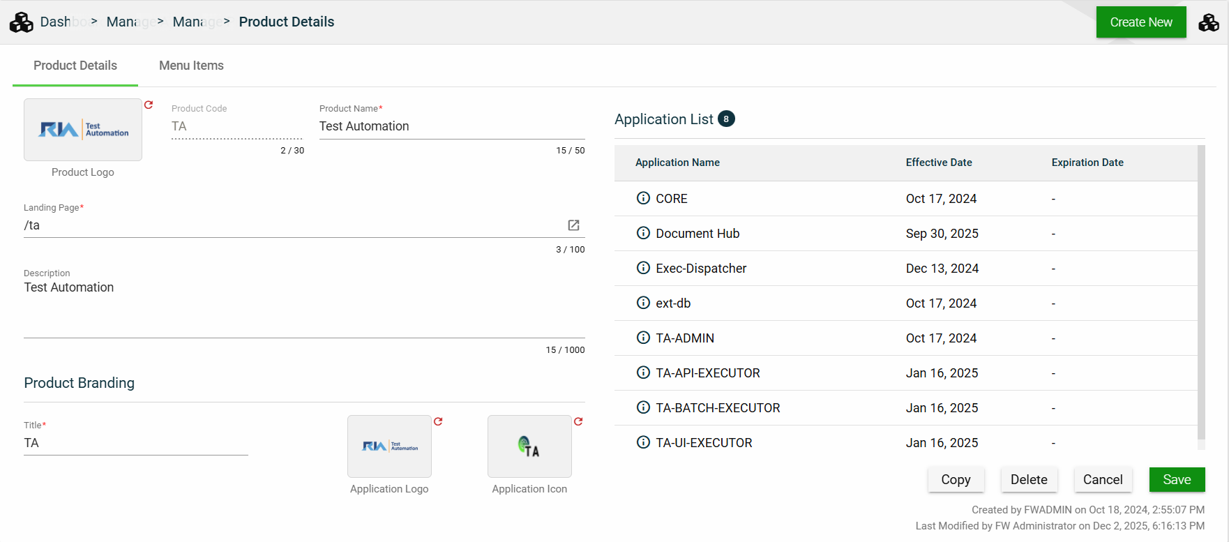 This tab allows you to update all the fields except for the Product. Additionally, you can choose to expire, copy, or delete the selected application from this tab.