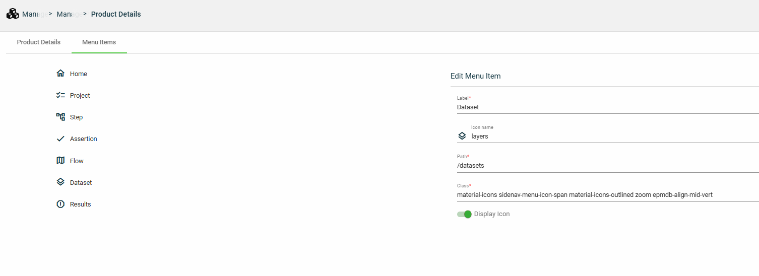 Menu items — manages menu options displayed in the left navigation of a product.