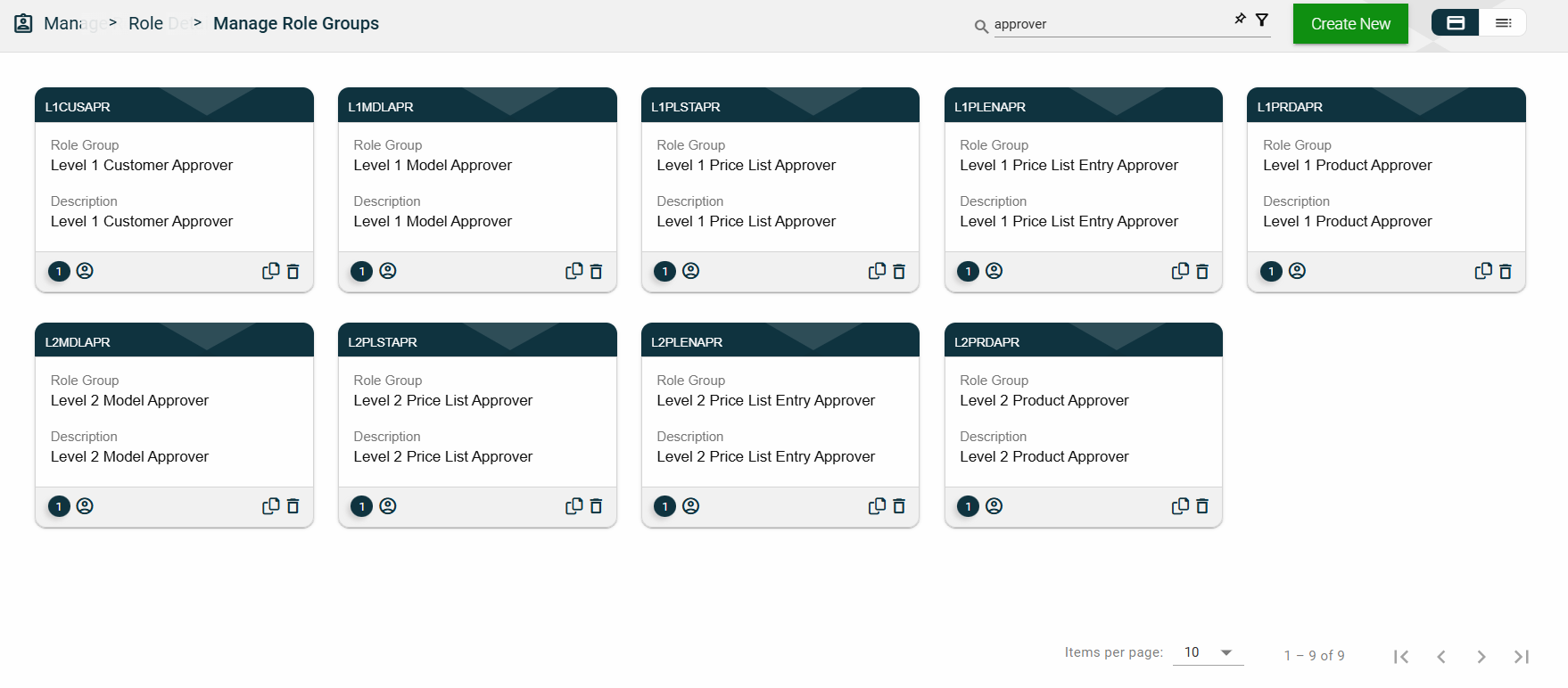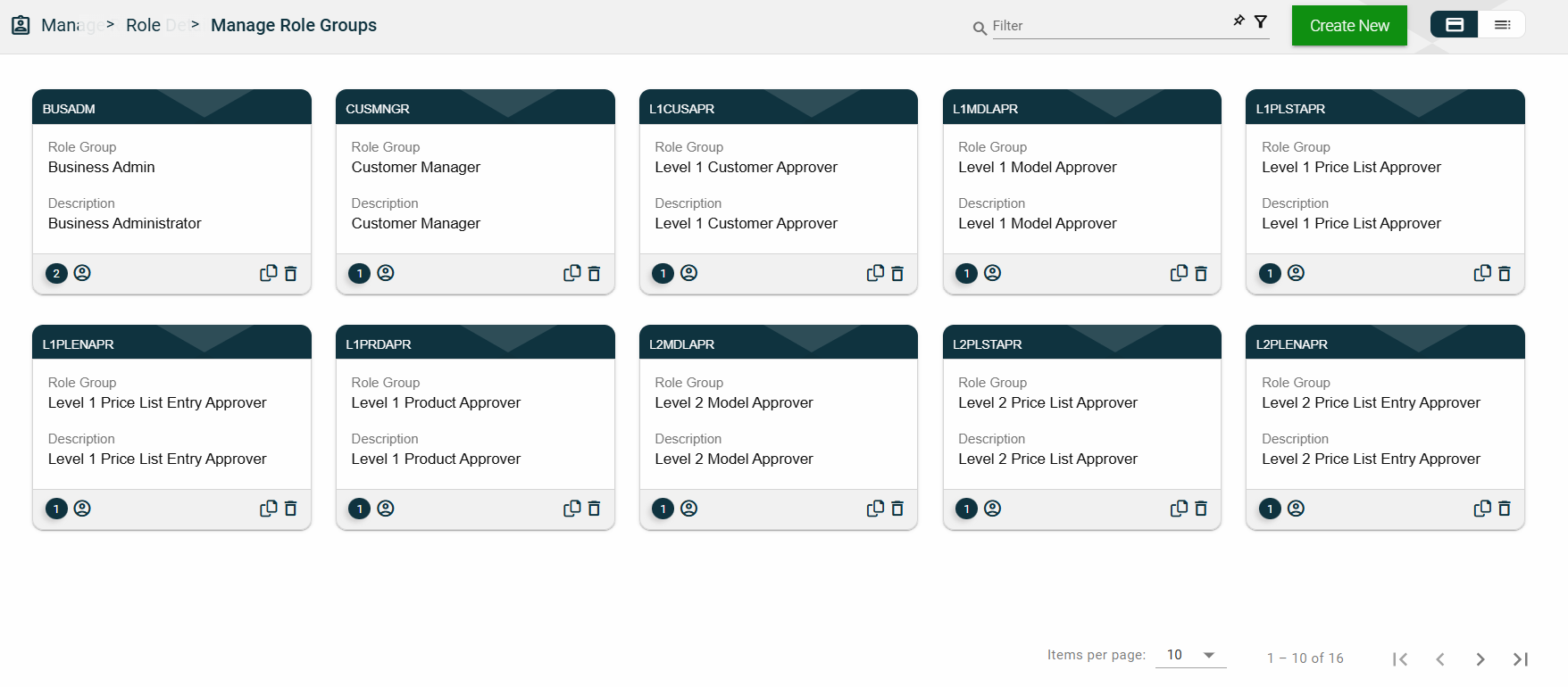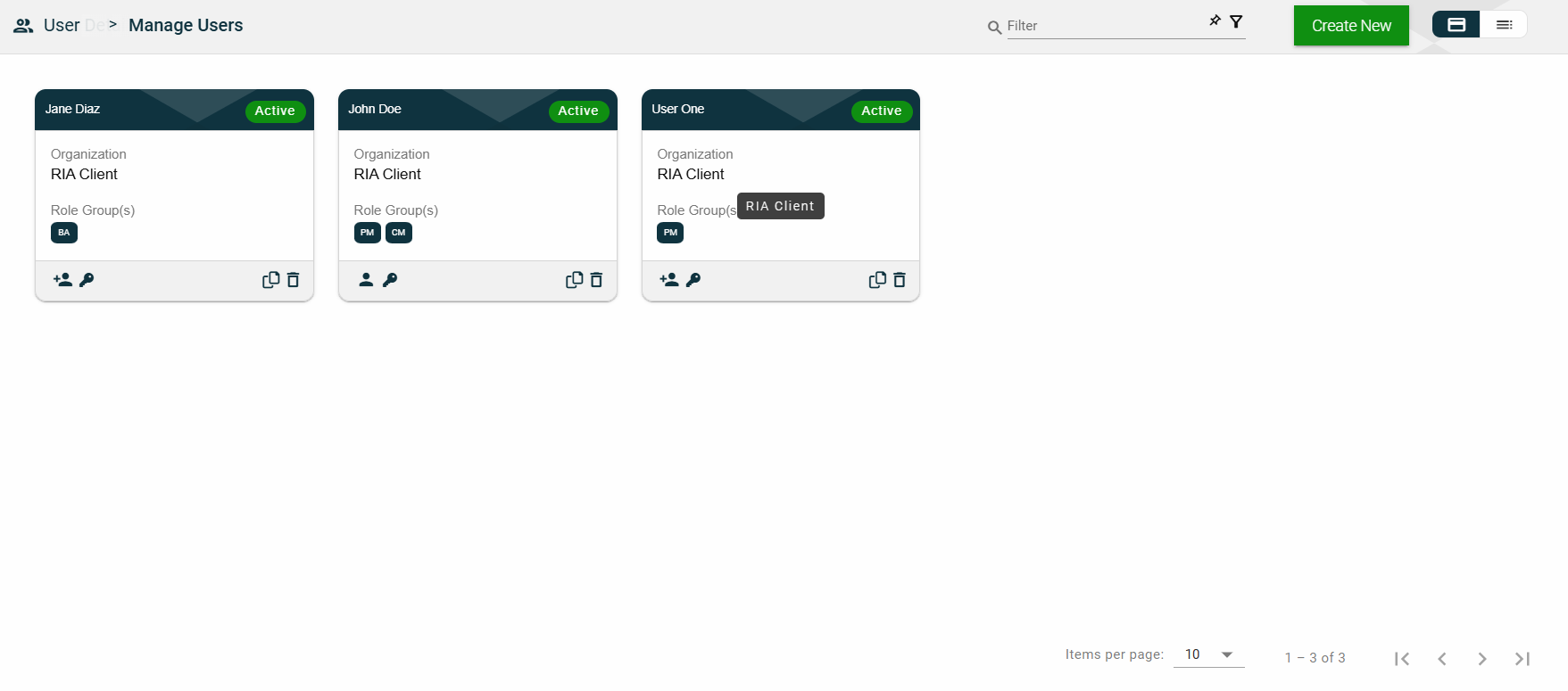 The card view presents all users in the form of cards, with the user’s first and last names and the status on the card header. The card displays the Organization name and Role Group(s). The card footer displays an icon indicating the user type, a duplicate icon, and a delete icon.