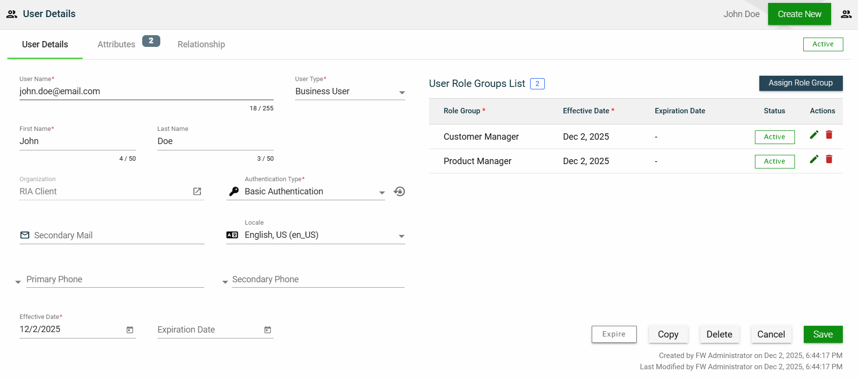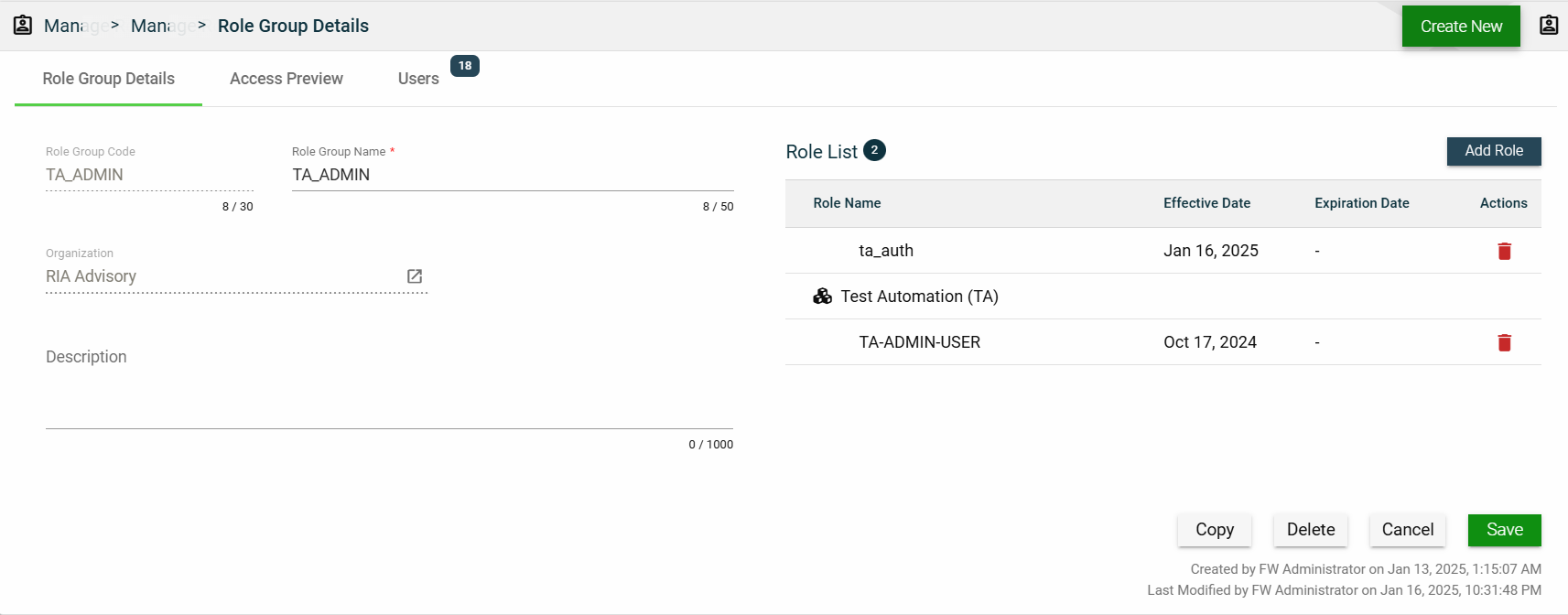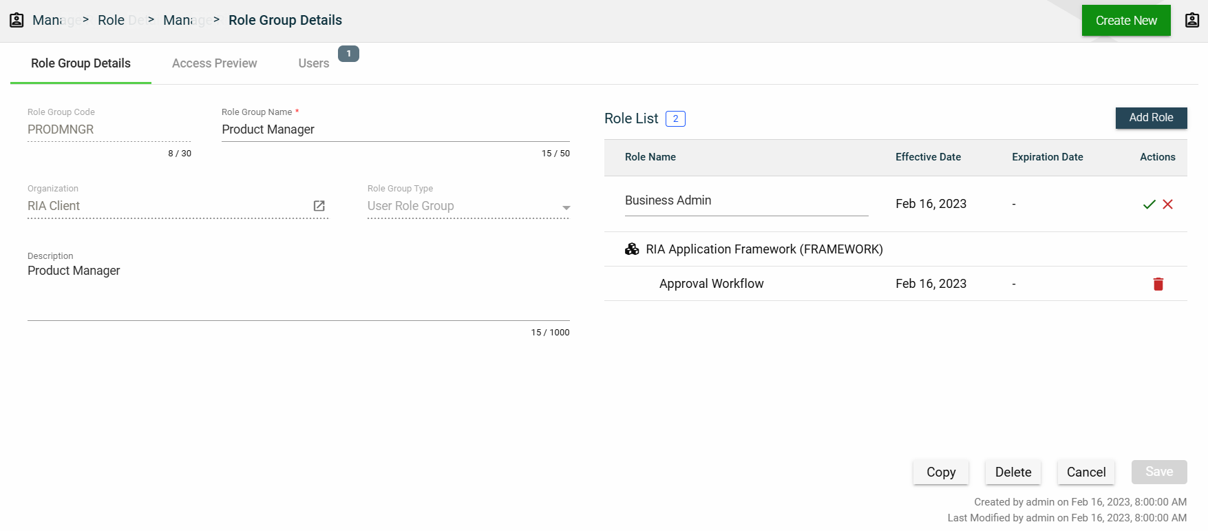 This tab allows you to update all the fields except for the User Type and Organization. Additionally, you can choose to expire, copy, or delete the selected role group from this tab.