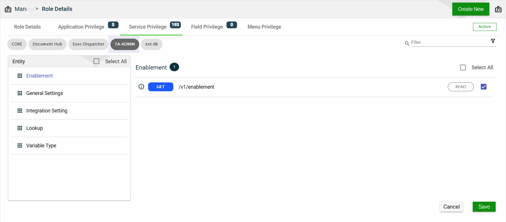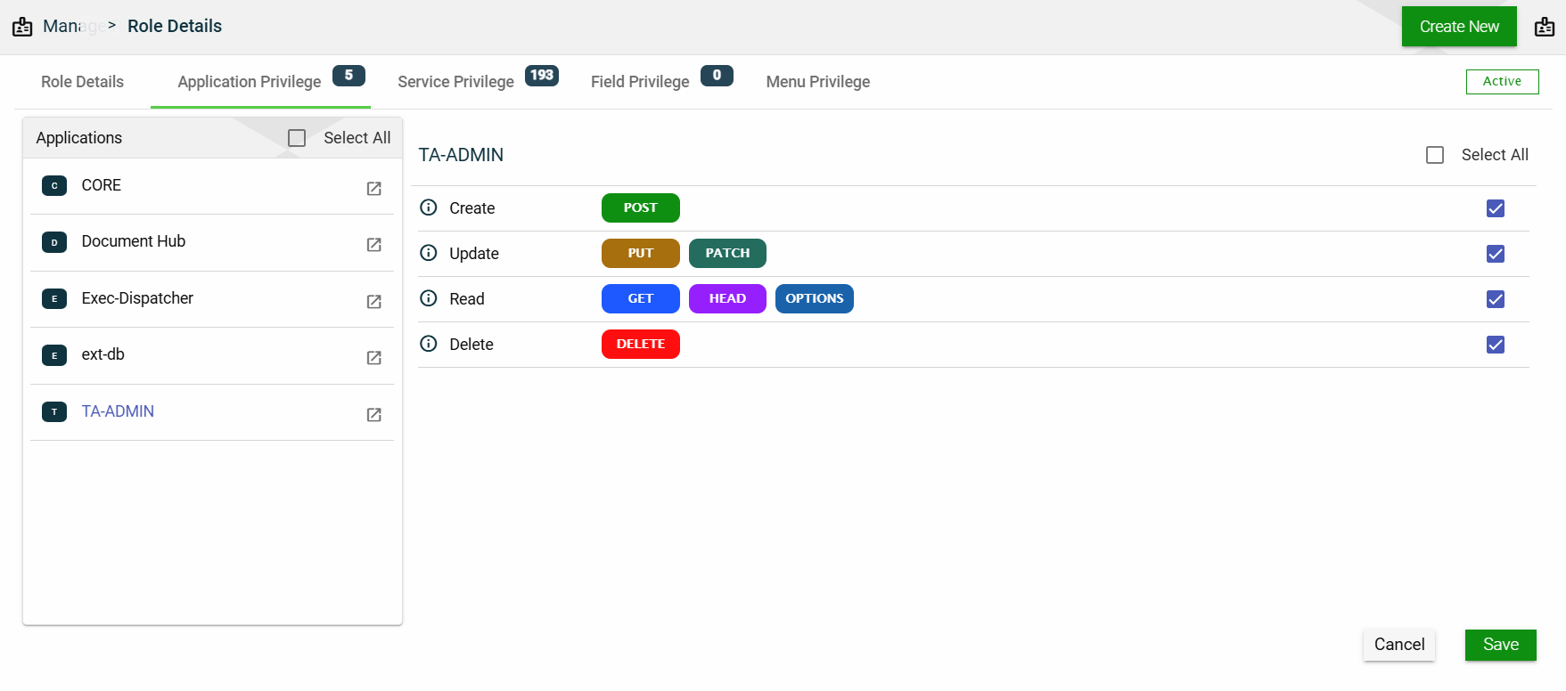 Application Privilege — when selected, you also have to specify allowed HTTP methods.
