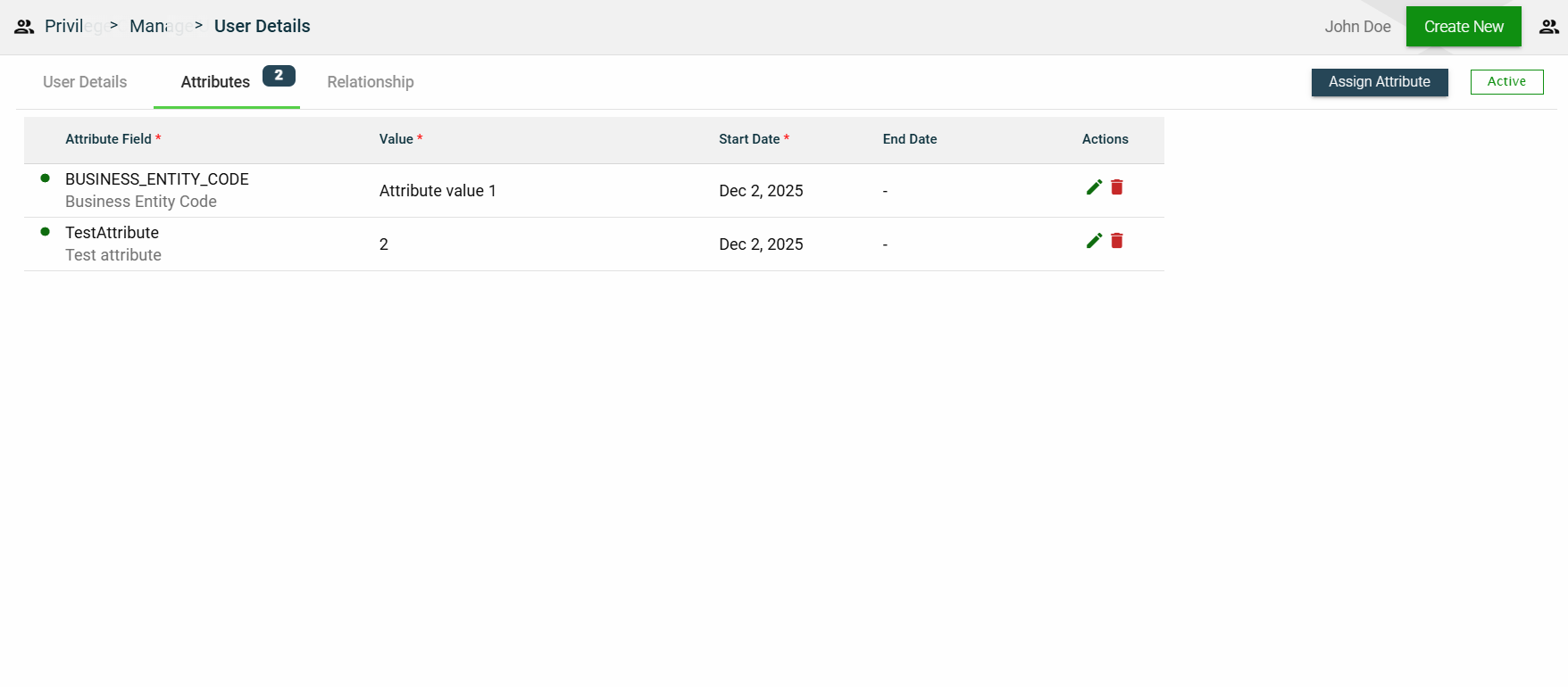 The attributes tab displays the properties associated with the user, including their value, effective date, and expiration date. It also allows users to add, edit, or delete an attribute.
