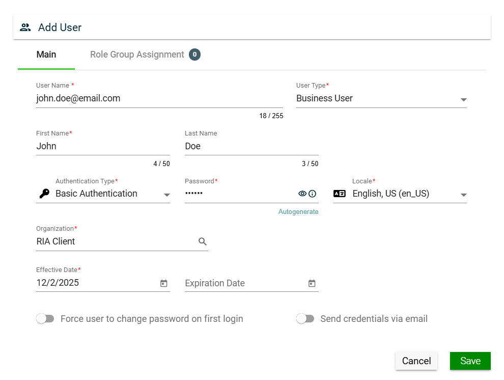 The User Details tab shows all the information you added when creating a role group. For more information about the fields, see Create a role group. Additionally, this tab allows you to add the following user information: